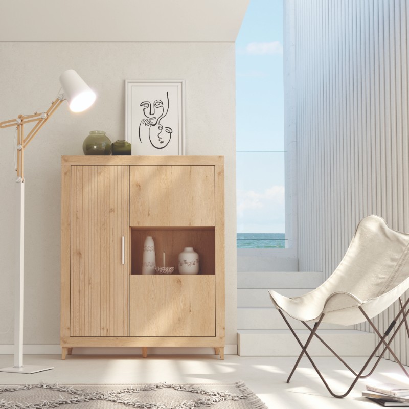 Aparador alto con líneas rectas y modernas, con un hueco para aligerar la pieza y darle ese toque de decoración. Puedes acompañar este aparador con una mesa de comedor o de centro, o con un módulo TV, esta firma tiene varios módulos para poder combinar entre sí y así personalizar tu salón comedor.