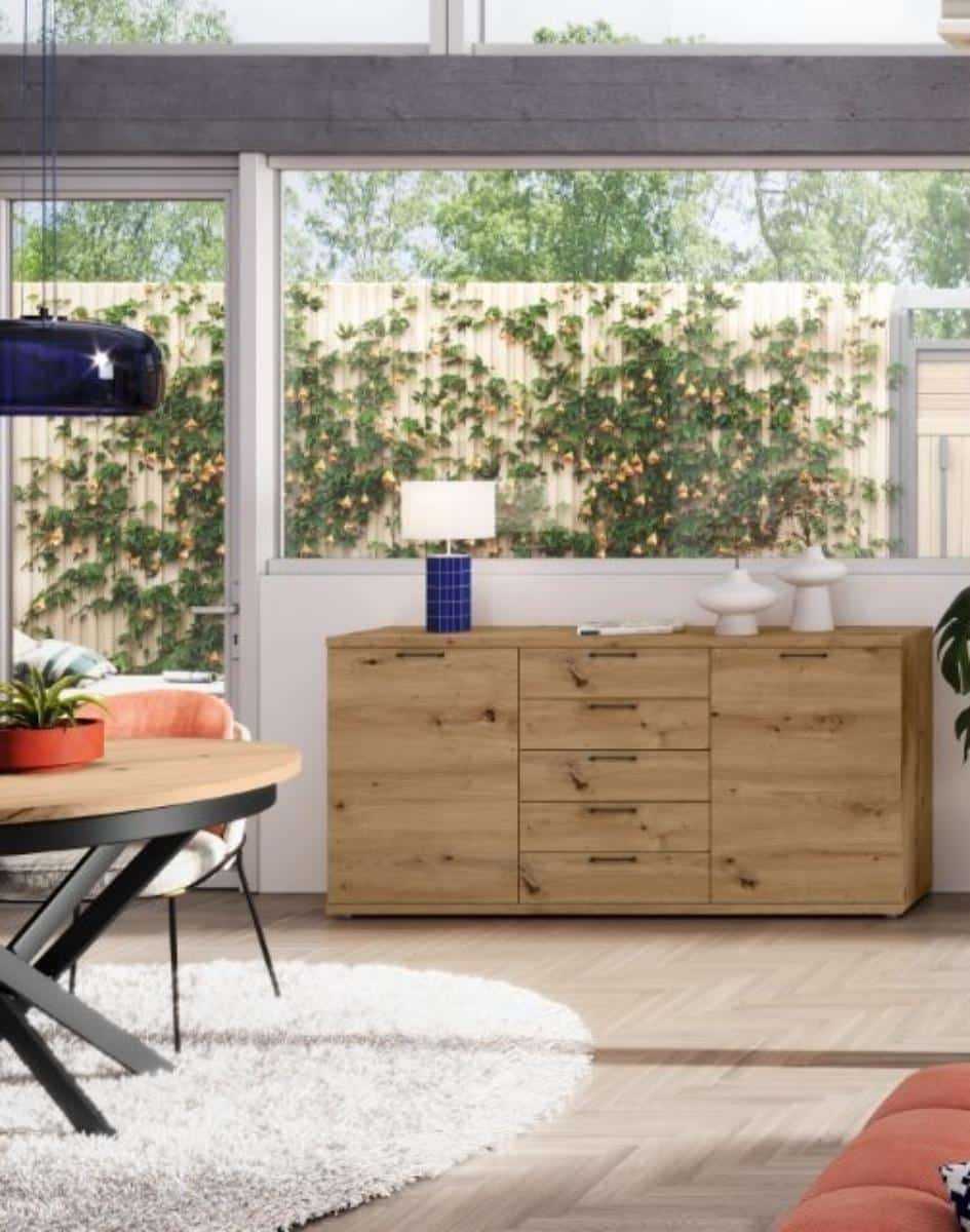 Completa la armonía de tu comedor con este aparador a juego, una pieza de almacenamiento excepcional que mantiene la calidez y el estilo del color Artisán. Diseñado para integrarse de forma fluida con el resto del mobiliario, este aparador destaca por sus tiradores en color negro, que aportan ese toque de contraste moderno y ordenado. Su diseño robusto y funcional lo convierte en el aliado perfecto para mantener la organización de la mantelería, cubertería y vajilla, elevando la estética de la estancia con su presencia sólida y elegante.