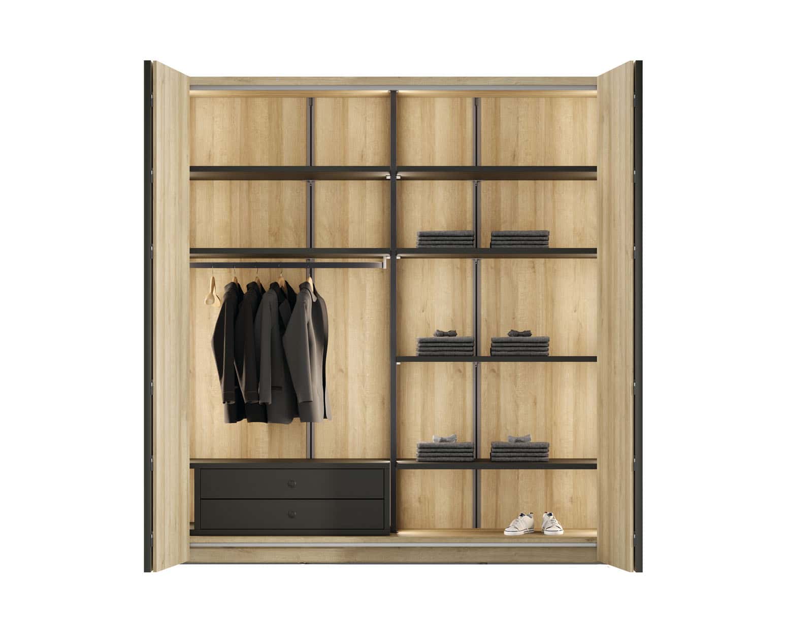 Al abrirse completamente, lo tienes todo a la vista. La apertura plegable de las puertas permite un acceso más cómodo al interior del armario.