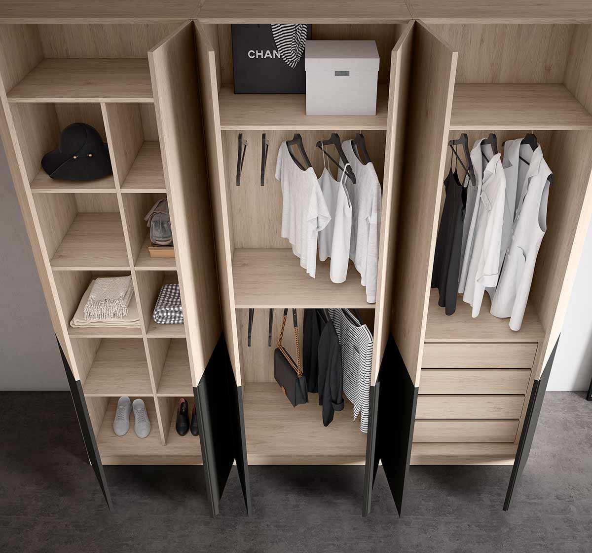 La peculiaridad de este armario son sus puertas que son plegables. La ventaja además de su diseño es que no se necesita demasiado espacio para abrir las puertas ya que se pliegan a la mitad. Esta marca tiene multitud de interiores predefinidos para armario, incluso lo puedes personalizar a tu gusto, con diferentes complementos como cajoneras interiores, estantes, barras de colgar, divisores, etc.