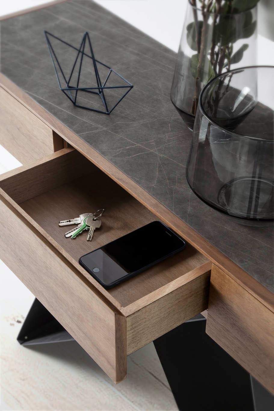 El tono de la consola es siempre color nogal, pudiendo cambiar el tono de la pata metálica en colores tan actuales como blanco, gris oscuro, cobre, oro, arena etc…también tienes diferentes porcelánicos para la tapa de la consola, ¡ven y elije el que más te guste!