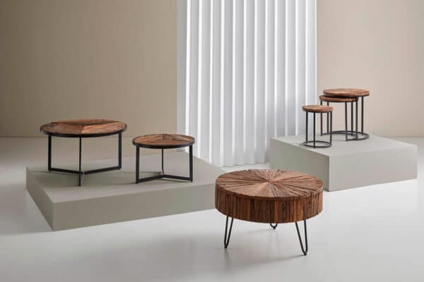 Mesa centro redonda con tapa de madera reciclada y patas de hierro lacado mate. La tapa de 16 cm de grosor resalta la personalidad de la mesa. Es de madera maciza de teca reciclada, una madera que además de sostenible es altamente resistente y tratada para estar mejor protegida.
