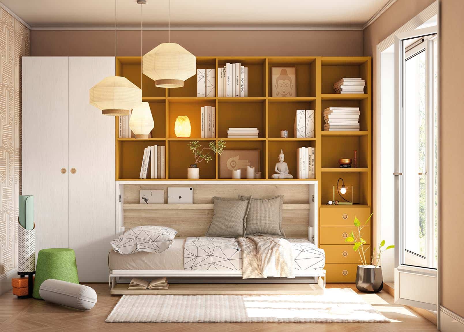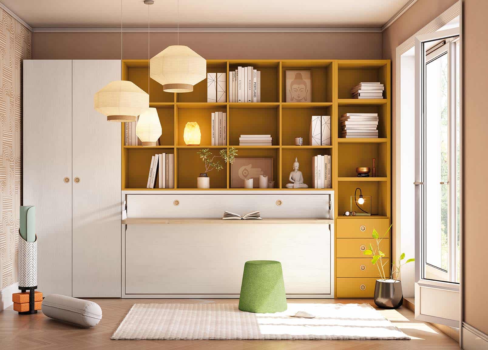 Las estanterías de la parte superior quedan genial para que la pared donde se encuentra la cama abatible esté repleta de tu decoración y tus complementos. Adáptalas según las medidas de la cama abatible y elige si prefieres estanterías o armarios. Esta cama abatible la puedes elegir sola y complementarla a tu manera: estanterías y armario a juego.