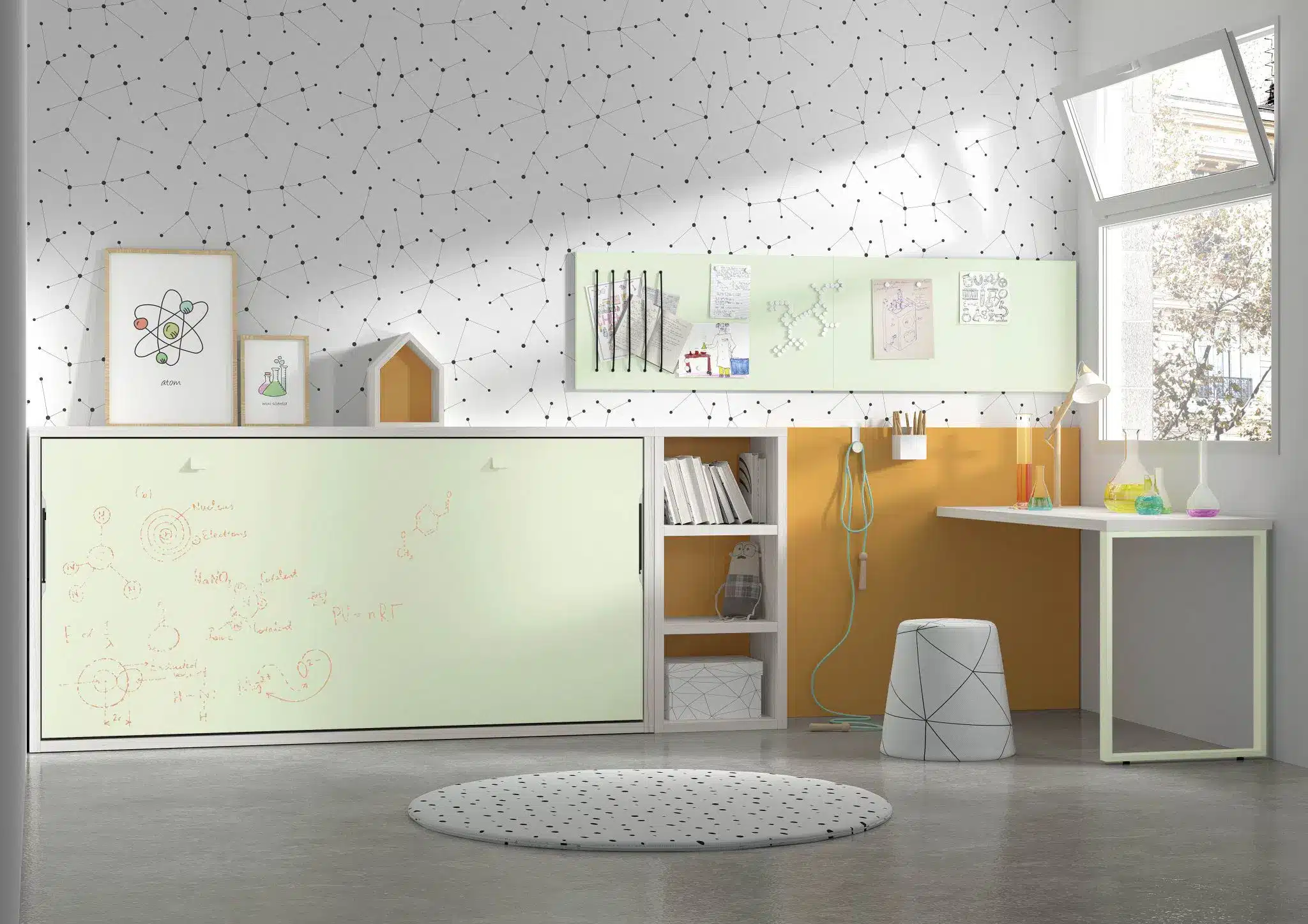 Además hemos pensado en una zona de estudio. Un escritorio con un panel para pintar y dejar sus cosas.