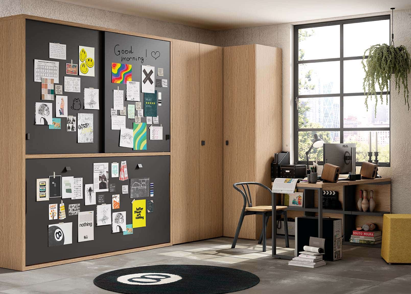 Para completar la habitación juvenil con cama abatible, te proponemos un escritorio con cajones y estantería con puerta colgante. Esta propuesta queda elegante y además, ayuda a administrar el espacio y disponer de un lugar para estudiar y trabajar.