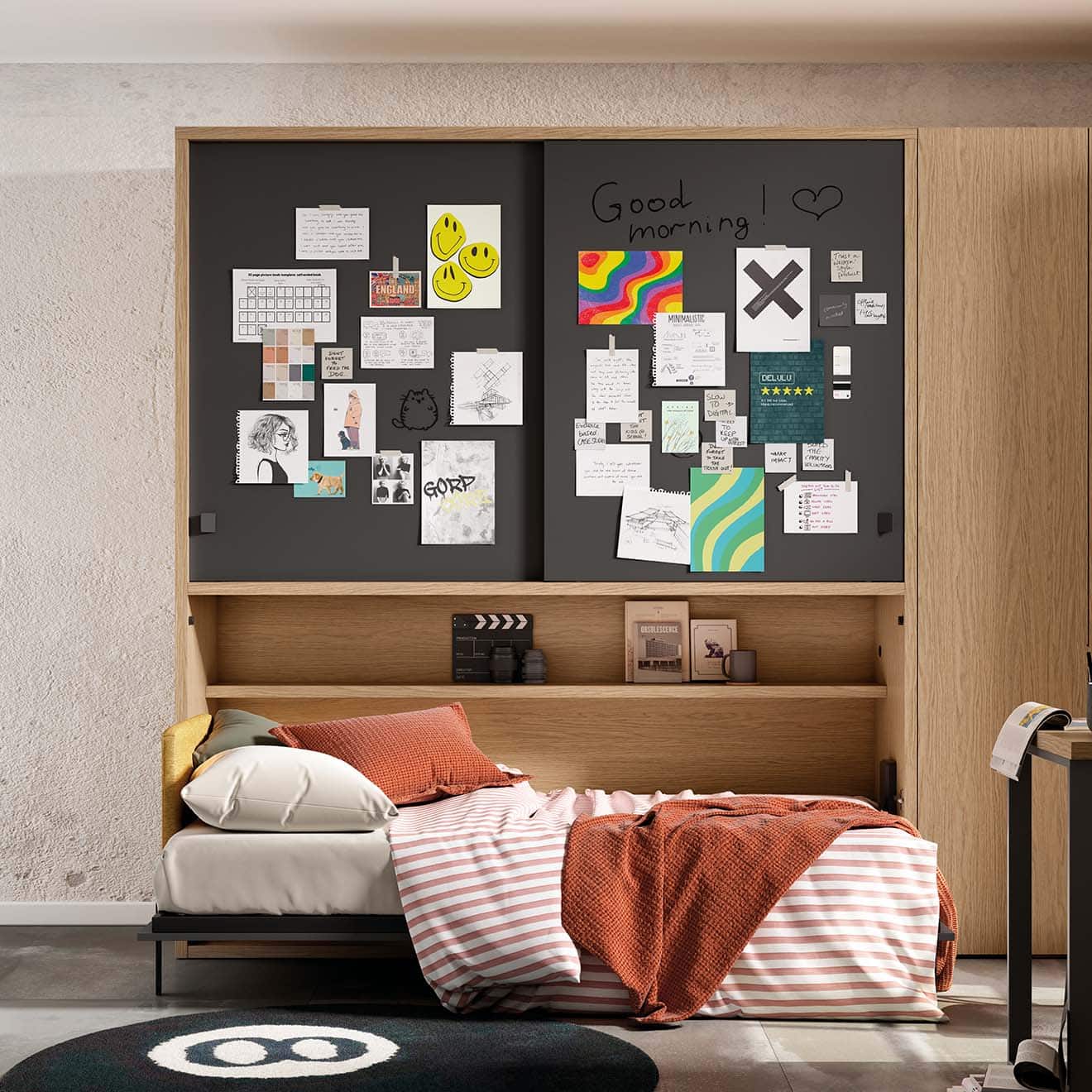 Una cama abatible con armario de puertas correderas que puede utilizarse como despacho, como habitación para los invitados o como habitación habitual. Tú decides el uso que le quieras dar, y también cómo quieres que sea. Por este motivo, te abrimos un amplio abanico de posibilidades que te permitirán crear una habitación según tu gusto y necesidades.