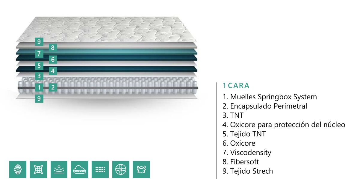 - Tejido strech de alta calidad con tratamiento antiácaros. - Muelles ensacados. - Refuerzo perimetral. - Viscodensity. - Oxicore. - Indeformable. - Anatómico. - Antiácaros. - Transpirable. - Atérmico.