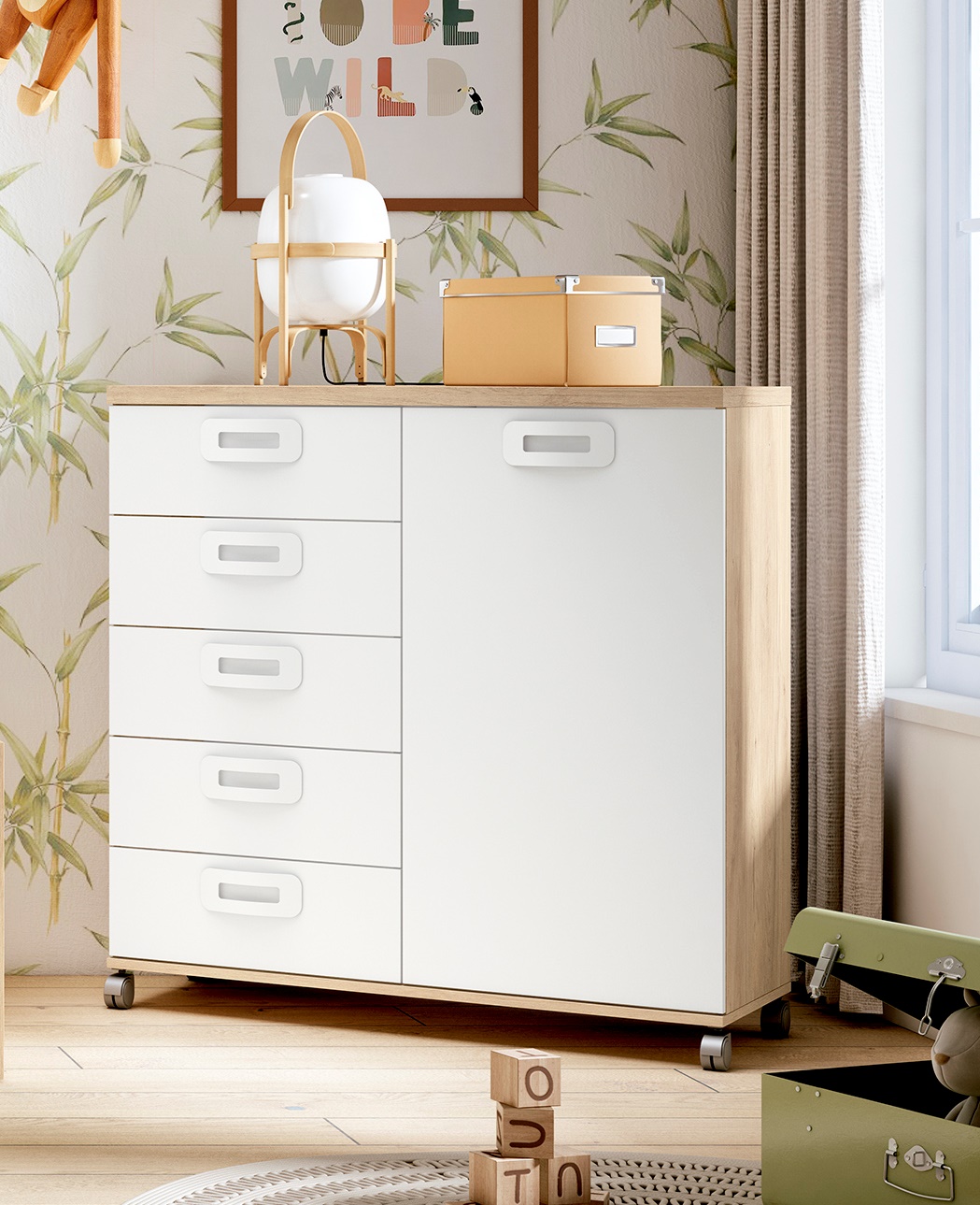 Una cómoda mixta con 5 cajones y 1 puerta con gran almacenamiento con ruedas para que puedas moverla por el espacio de tu dormitorio. Ahora no tienes excusa para guardar todo tipo de cosas que pensabas que no se podían guardar en cajones, ya que tienes la opción de la puerta…¡¡todo un 2 en 1!!