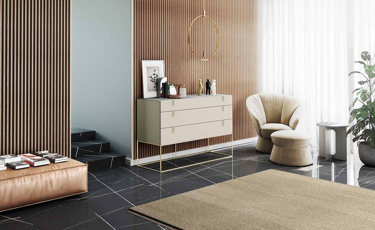Ejemplo de ello es esta cómoda de cajones lacada con pata metálica dorada, a nosotros nos encanta… ¿y a ti?