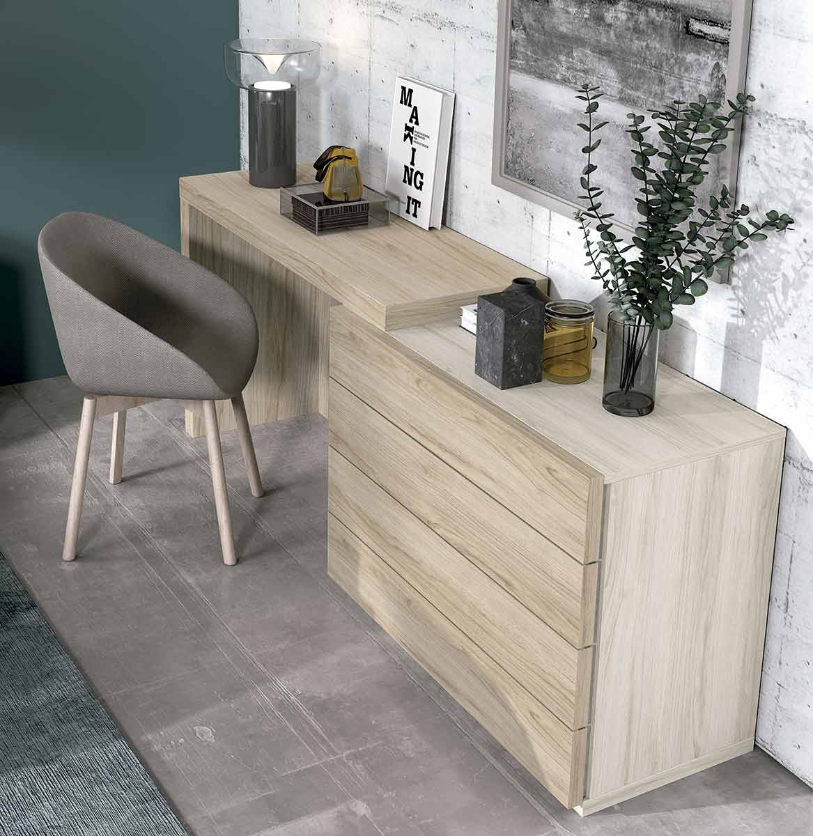 En la última fotográfia podrás encontrar un complemento para hacer tu dormitorio único, si tenemos una pared amplia en nuestro dormitorio se trata de una mesa de escritorio apilada a una cómoda de cajones. Ideal para almacenar en cajones a la vez que podemos escribir o utilizar nuestro portátil en ella, buscando la comodidad ya que si hay una parte de la casa donde tenemos que estar cómodos es en el dormitorio de matrimonio.
