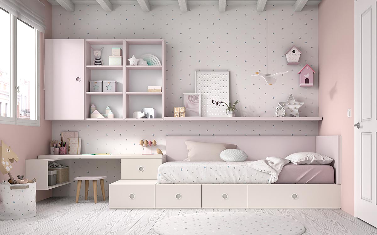 ¿Te gusta el escritorio infantil a continuación de la cama? Está montando a la altura de los niños para que tengan todo a su alcance. Esteticamente parece que va en una sola pieza y, además, es muy práctico para habitaciones pequeñas