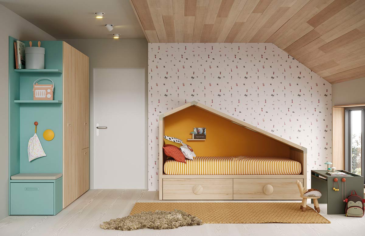 Dormitorio infantil con cama cottage, armario de puertas plegables y mesa infantil