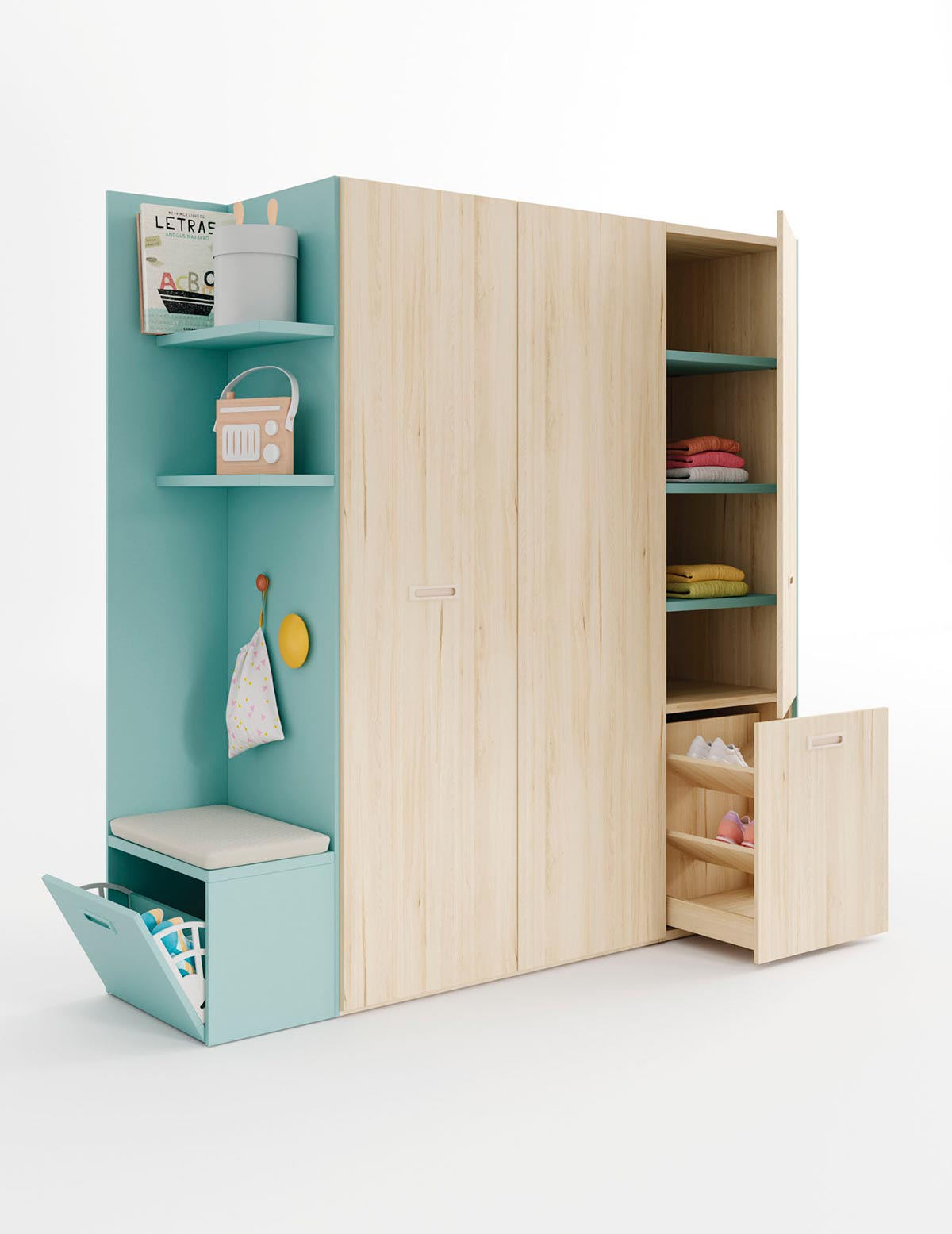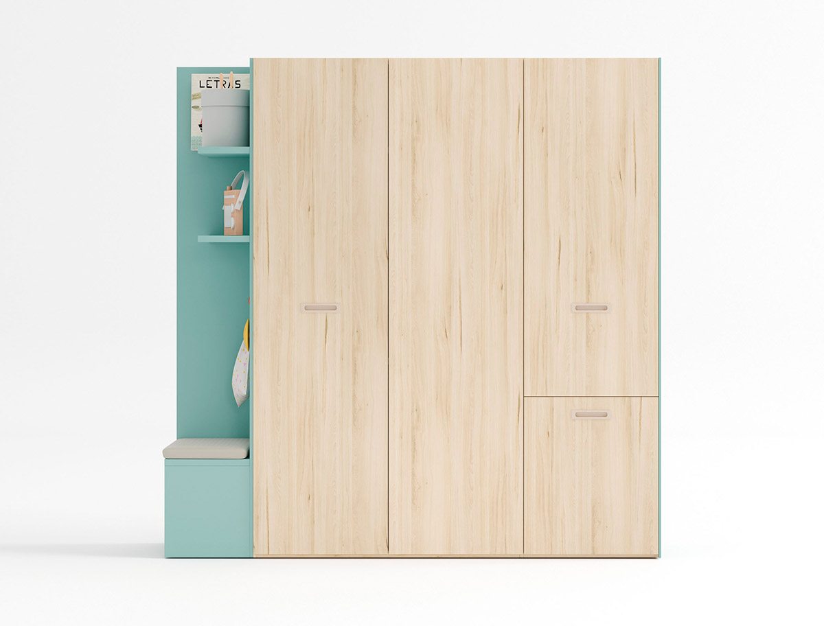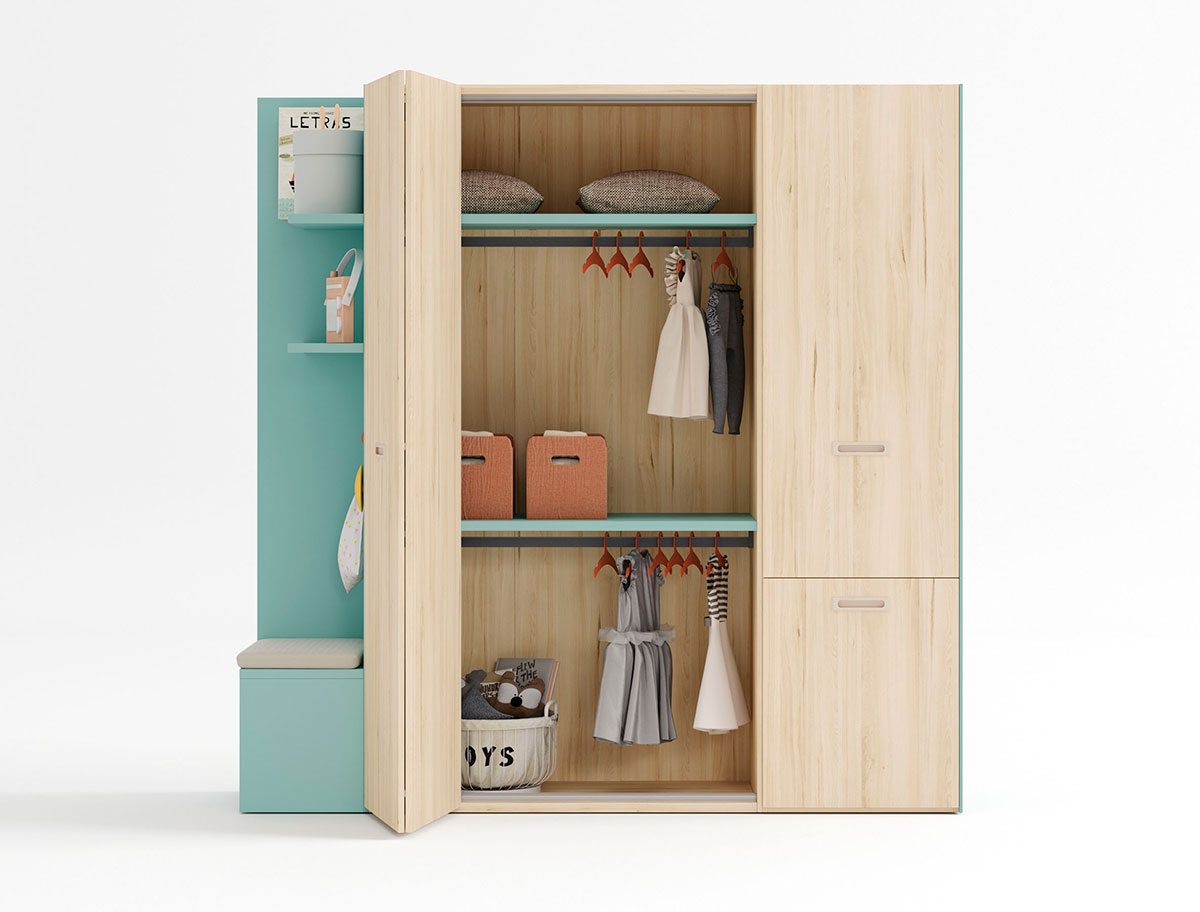 Dormitorio juvenil compuesto de un armario de puertas plegables, zapatero extraible. El interior del armario se compone de doble barra dando mayor capacidad. El módulo terminal tiene un banco acolchado y estantes para decorar la entrada al dormitorio y no encontrarnos con un costado raso, además se complementa con estantes y percheros ofreciendo funcionalidad y diseño. El armario de puertas plegables es muy practico y accesible dentro de nuestra sección armarios habitación juvenil.