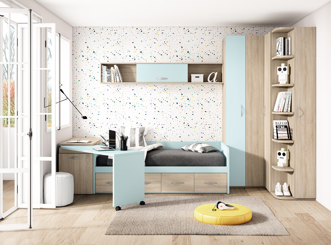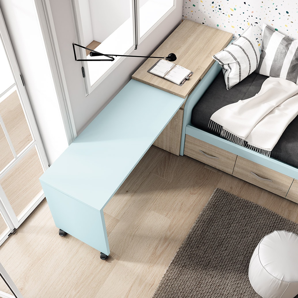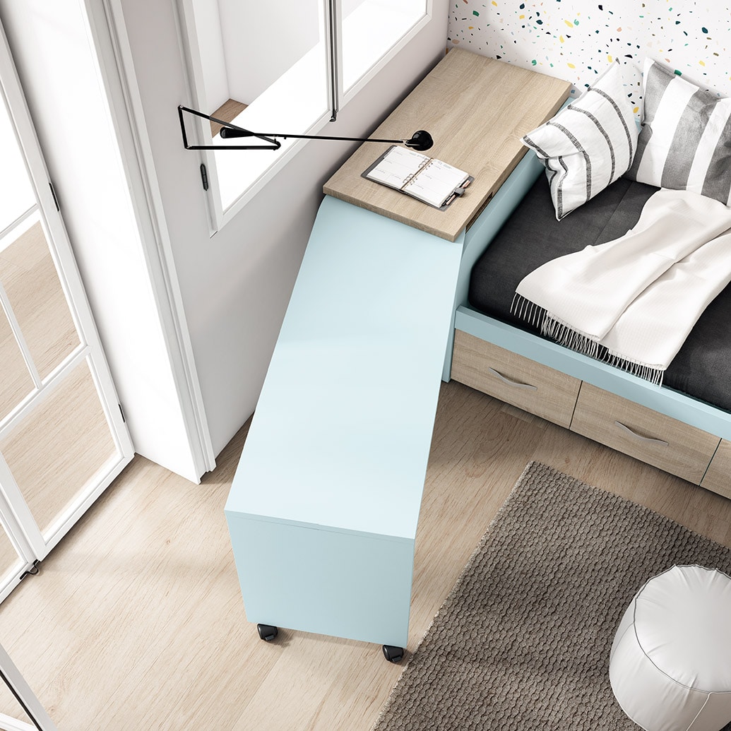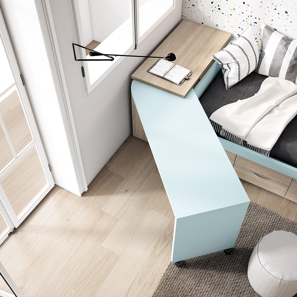 Este dormitorio juvenil tiene algo muy especial que pocos dormitorios juveniles tienen, la encimera de la mesa estudio es giratoria, ideal para poder colocarla delante de una zona de paso como puede ser un balcón y tener acceso al mismo sin complicaciones cuando tú lo necesites. En los detalles fotográficos podrás ver e imaginar como es el sistema giratorio de la mesa. ¡Una imagen vale más que mil palabras!
