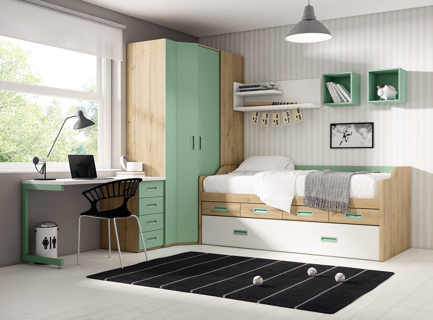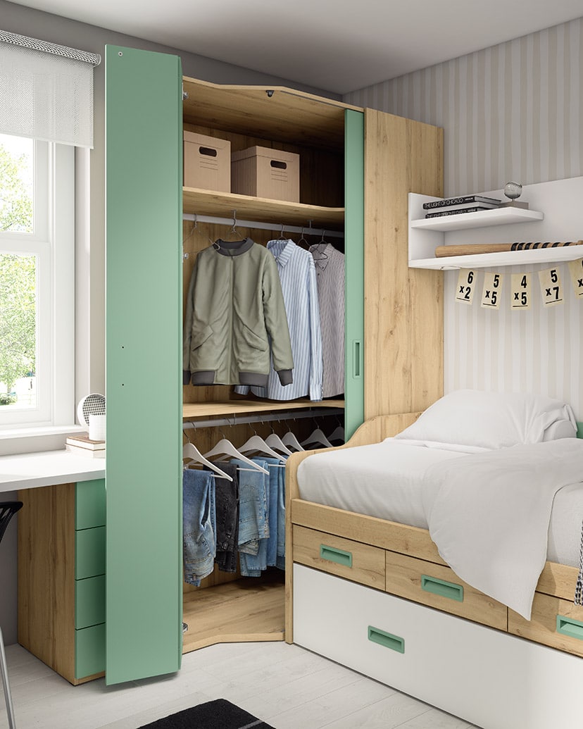La cama compacto contiene dos camas, para cualquier visita o incluso para que dos hermanos puedan compartir dormitorio. Además en la zona intermedia dispone de cuatro cajones. La cama superior tiene una altura de unos 70 cm con colchón incluido, es más baja que las convencionales ya que se reduce la altura de los cajones y la hace más accesible.