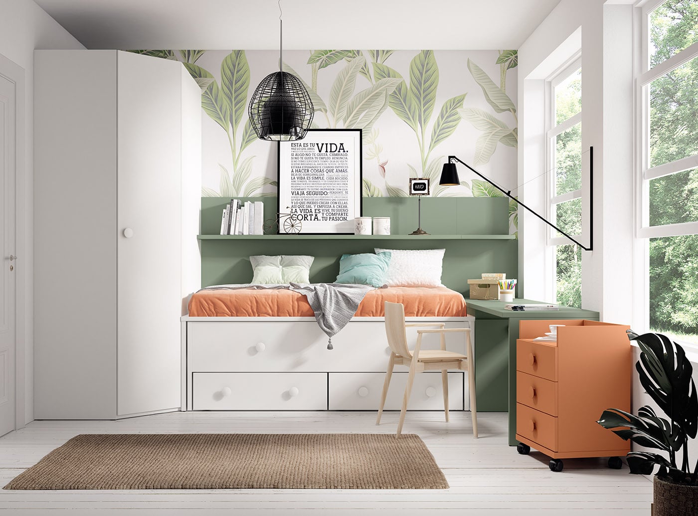 La bicama está compuesta de una cama superior con cuatro opciones de medida 90×190/90×200/105×190/105×200, la cama inferior siempre es 10 cm más corta de la opción que elijas, el ancho es el mismo. El colchón de la cama superior descansa sobre un tablero de 30 mm por lo que no precisa de somier de láminas. Este formato hace que la tarea de hacer la cama sea mucho más fácil y rápido ya que el colchón no va encastrado dentro de la cama. La cama inferior siempre viene bien para cualquier situación que te pueda surgir. Para complementar hemos diseñado dos contenedores de gran capacidad para que puedas organizar tus cosas sin problemas. Para la pared de la cama se ha utilizado un friso para dar calidez al dormitorio.