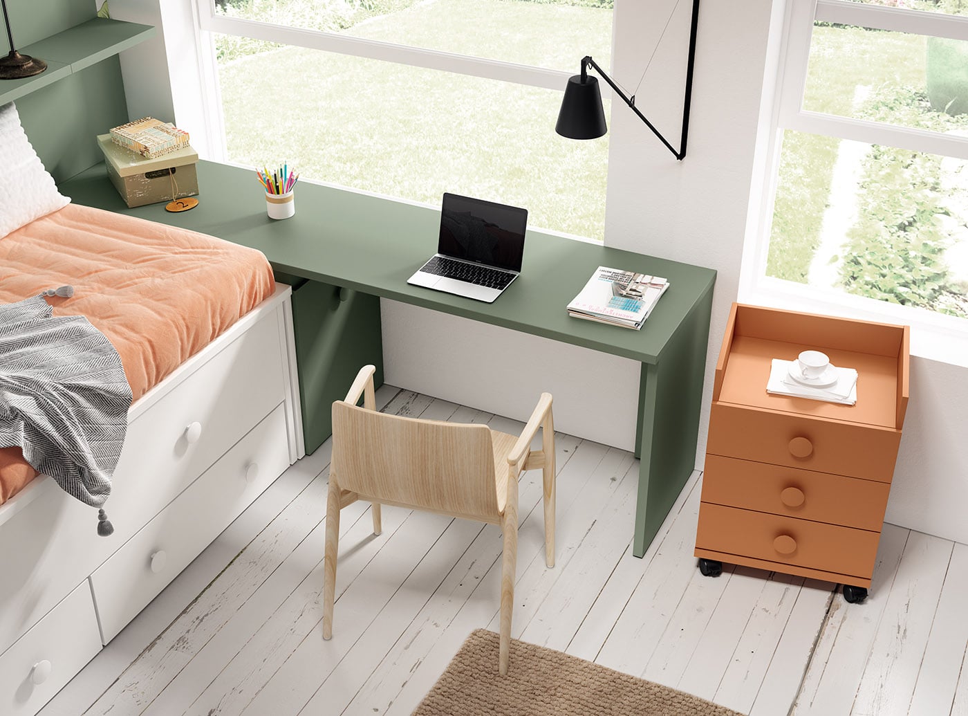 El escritorio lo adaptamos a la medida de tu estancia. Aquí lo hemos acompañado de una mesita de ruedas para que puedas sacarla fuera del escritorio cuando estudies y después devolver la mesita de cajones a su sitio.