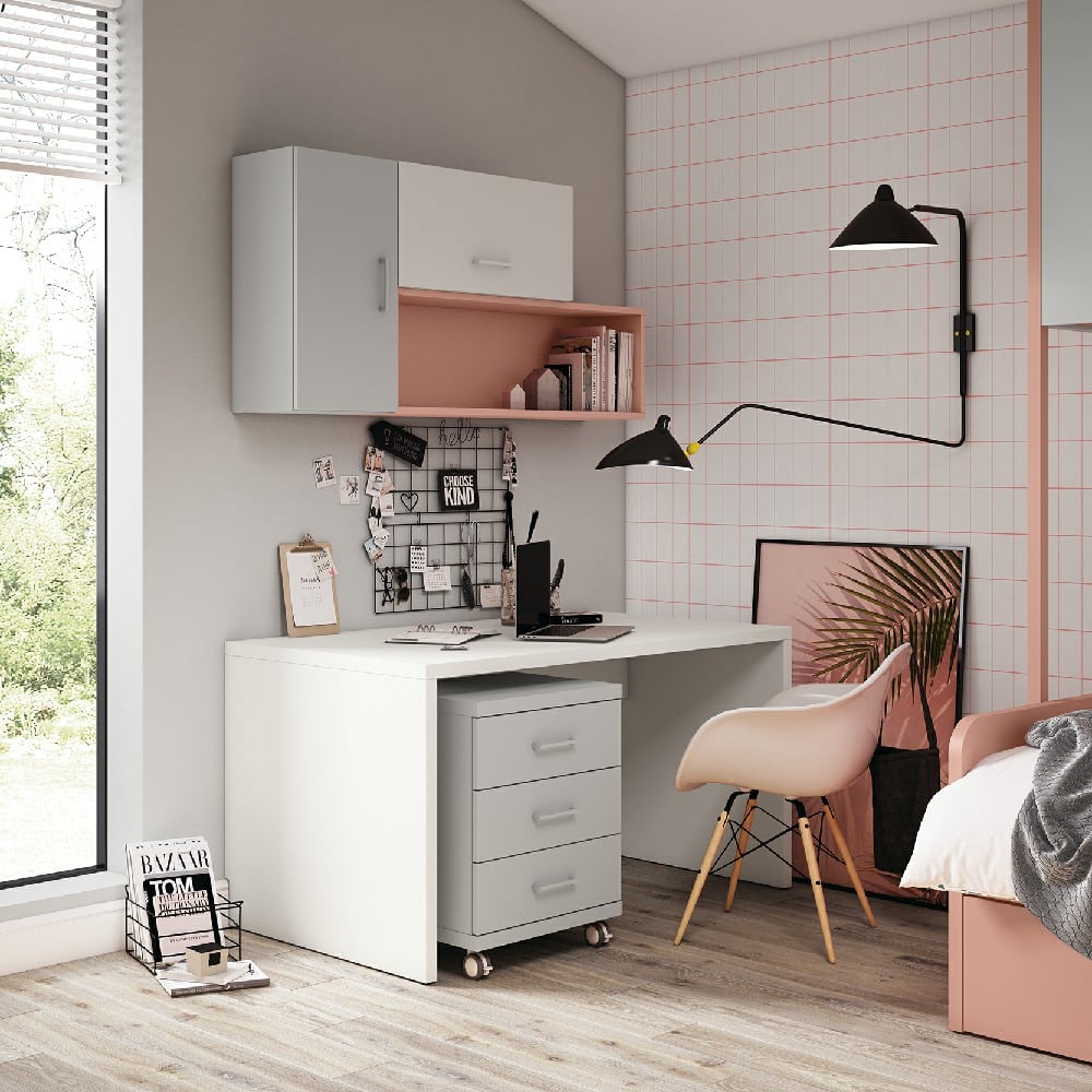 - Mesa de estudio amplia con cajonera móvil: Un espacio de trabajo diseñado para la concentración y la productividad. La amplia superficie ofrece comodidad para estudiar o realizar actividades creativas, mientras que la cajonera con ruedas proporciona un almacenamiento flexible y accesible para material escolar y documentos, pudiendo moverla según las necesidades del momento.