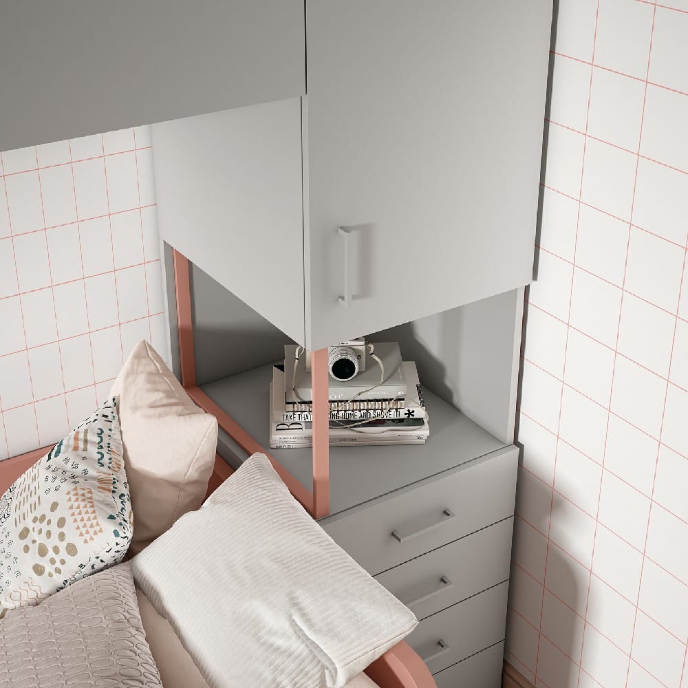 - Armario con cajonera lateral integrada: Un módulo adicional de almacenamiento al lado de la cama que ofrece espacio extra para objetos personales, libros o para organizar sus pertenencias de forma accesible.
