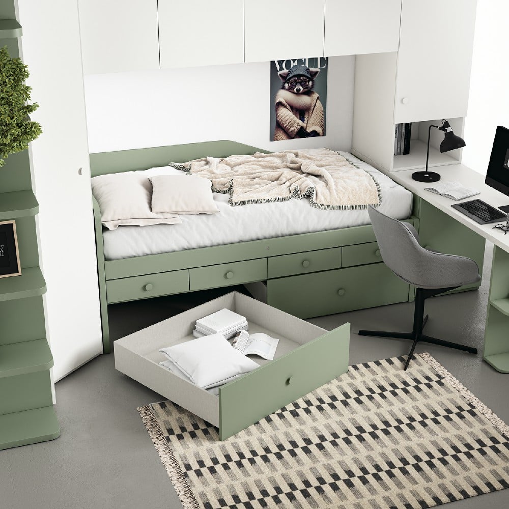 Y ahora, la parte que más nos entusiasma: ¡la personalización! Entendemos que cada joven tiene su propio estilo, por eso te ofrecemos una paleta de 25 colores diferentes para los módulos, ¡para que puedas crear la combinación perfecta que resuene con su personalidad! Además, podrás elegir entre 8 tipos de tiradores distintos para darle ese toque final y único al dormitorio.