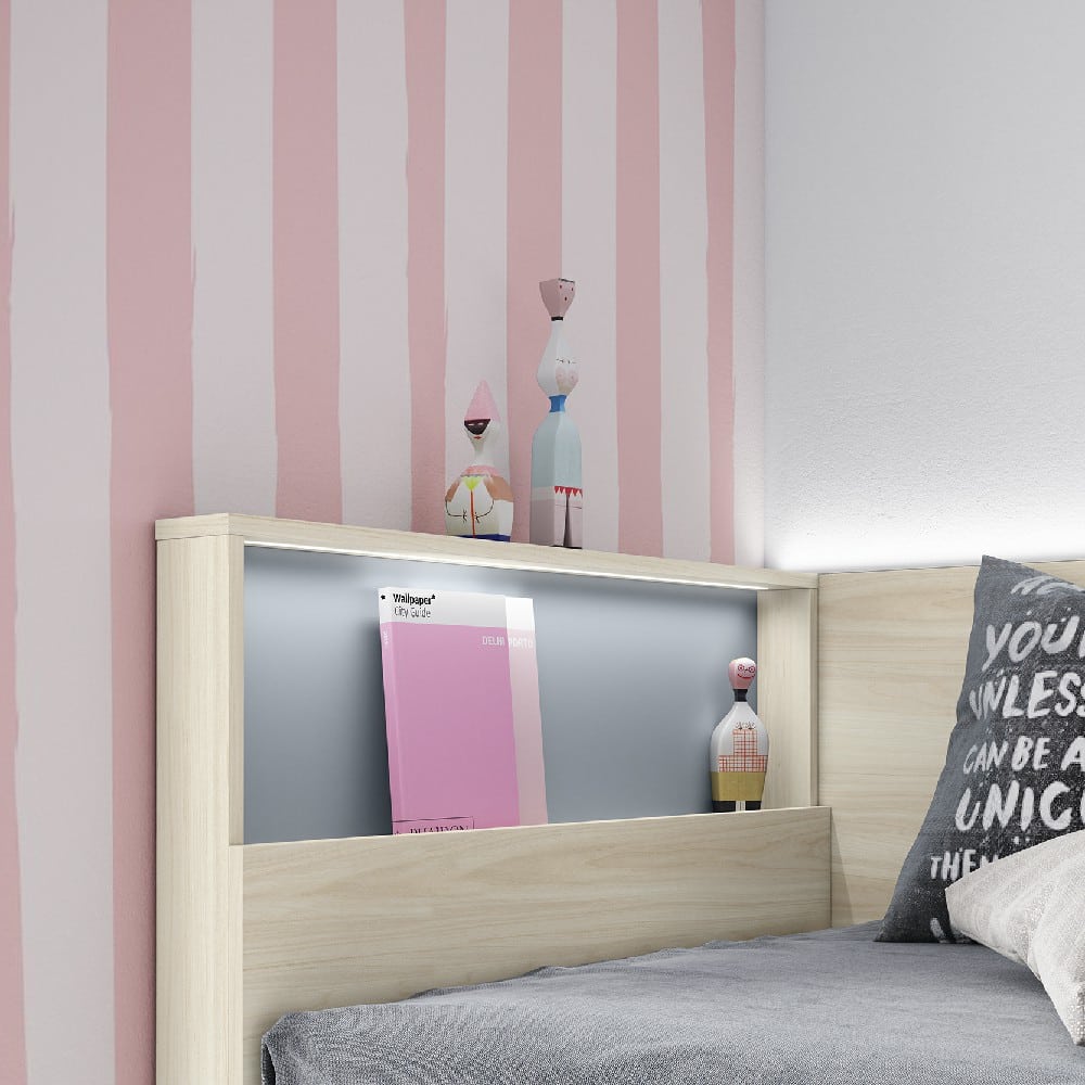 Cama Compacta con Cajones de Almacenamiento: Optimiza el espacio con esta práctica cama que incorpora dos amplios cajones inferiores, ideales para guardar ropa de cama extra, juguetes o material escolar. El cabecero, con un diseño moderno en tono madera clara, incluye un estante integrado con iluminación LED (como se ve en el detalle 02), perfecto para tener a mano libros, dispositivos o elementos decorativos.