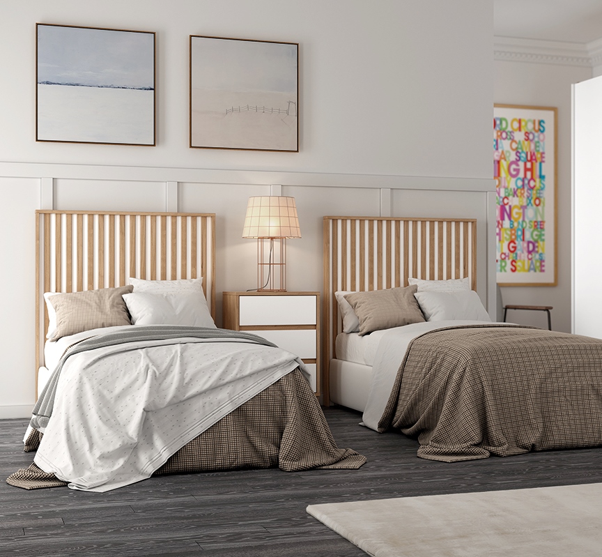 Dormitorio juvenil de estilo moderno y actual, combinando las últimas tendencias, cabezal con palillería, frentes de cajones sin tiradores y patas opcionales.