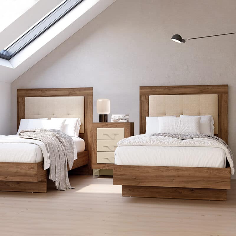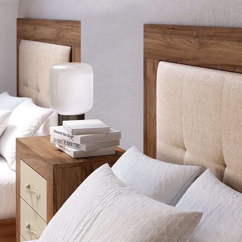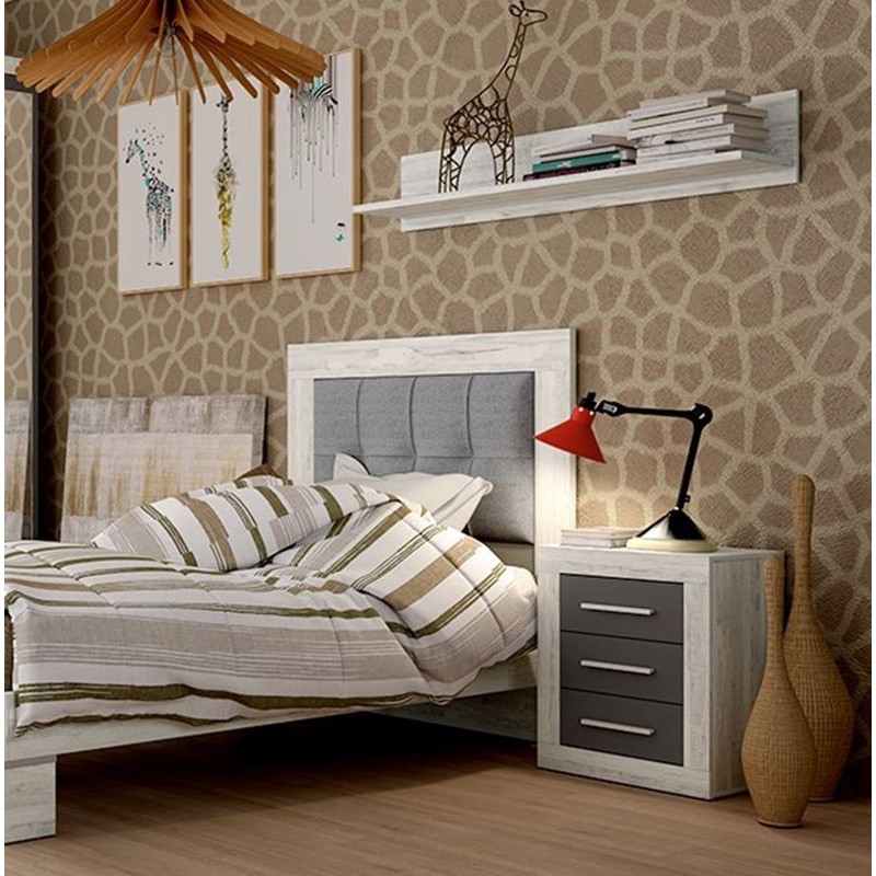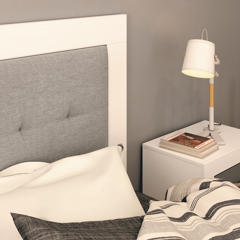 Composicion de cabecero tapizado en textil humo (también disponible en textil tierra, y polipiel blanca o gris). Fabricado con tableros de alta resistencia cubierto con material melamínico. Es un cabezal útil para colchón de 90 cm y también para colchón de 105 cm.