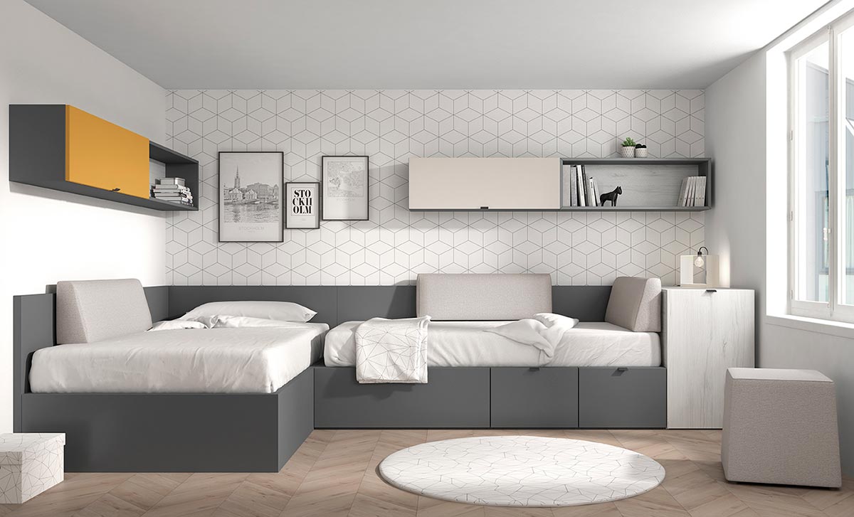 Una habitación para compartir entre dos herman@s. Dos camas individuales juveniles en L son una propuesta perfecta para un dormitorio juvenil, ¿es lo que estás buscando?