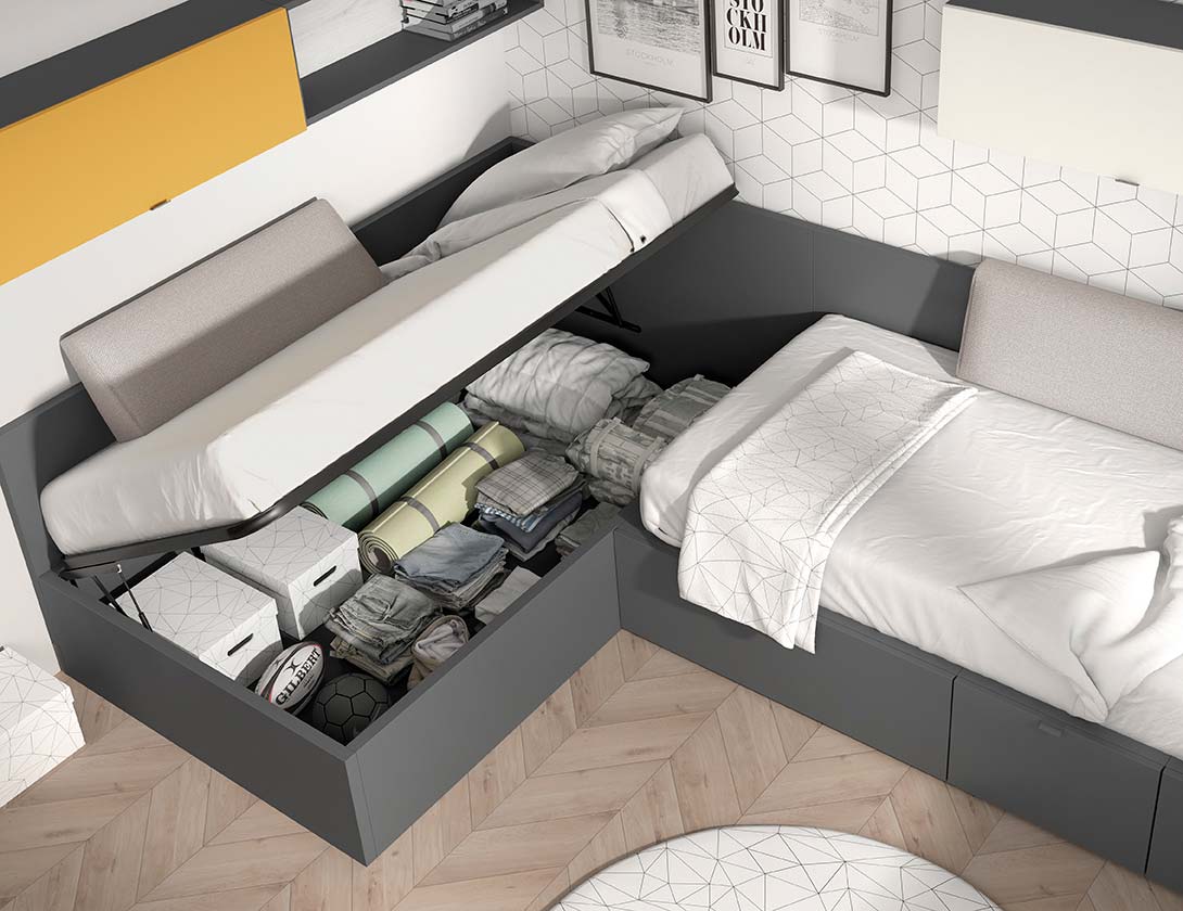 Una de las dos camas es una cama canapé, esto permitirá que el espacio de almacenaje sea inmenso. ¿No te parece una gran solución? No te olvides de las estanterías decorativas, y compleméntalas con nuestros cuadros y láminas juveniles, ¡te encantarán!