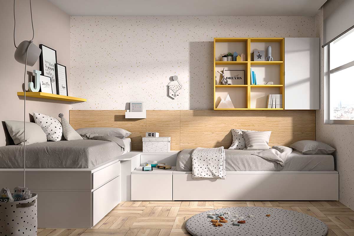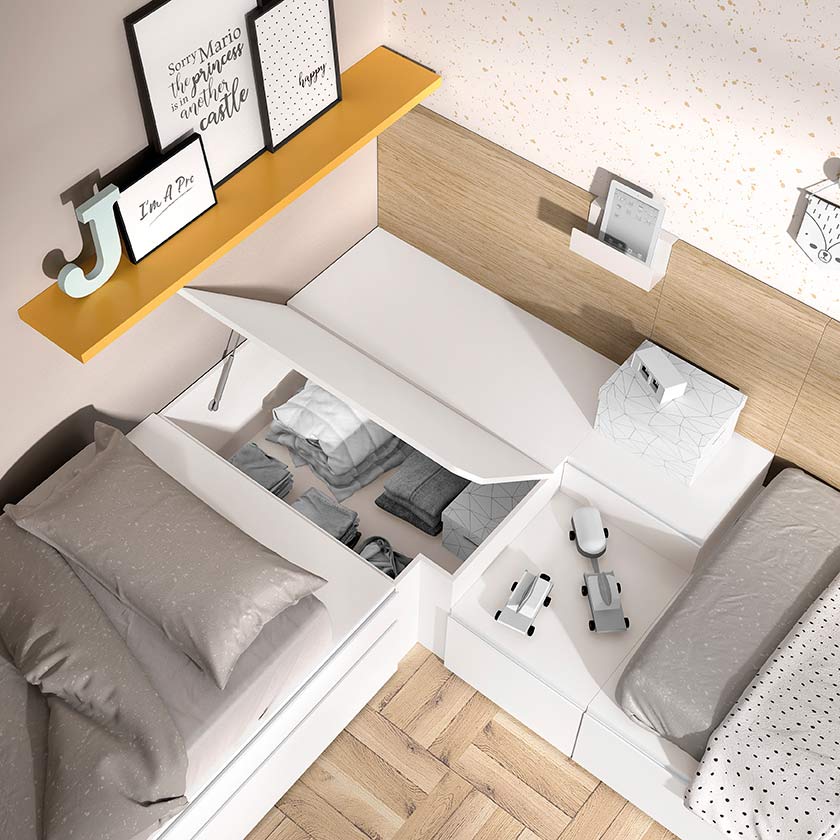Dos camas en L con arcones y cajones que facilitarán la administración del espacio de su habitación.