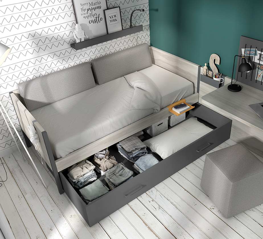 ¿Qué te parece esta cama nido con almacenaje? Se trata de una cama con un cajón que también permite poner un colchón. Podrás utilizarlo para guardar cosas y también para invitar un amigo a dormir. ¡Dos por uno!