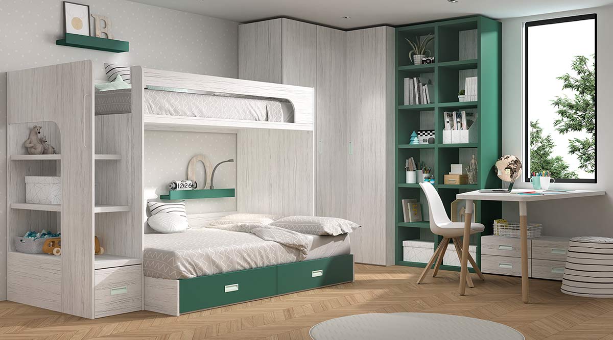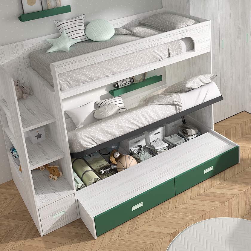 Con esta litera juvenil con canapé será mucho más fácil compartir la habitación entre dos herman@s. La parte inferior es para colchón de 135×90, ademas de ser una cama nido grande es también una cama nido con almacenaje ¡es genial!.