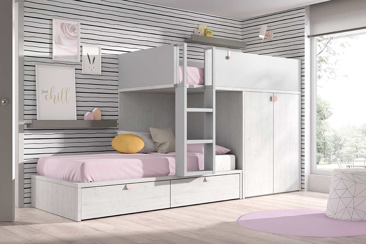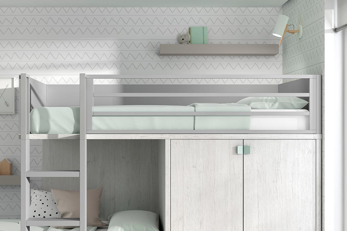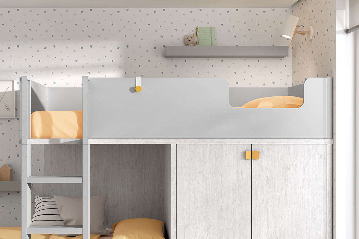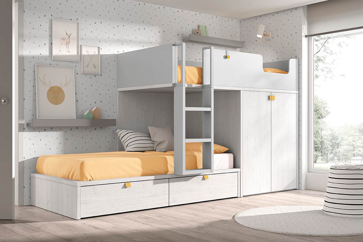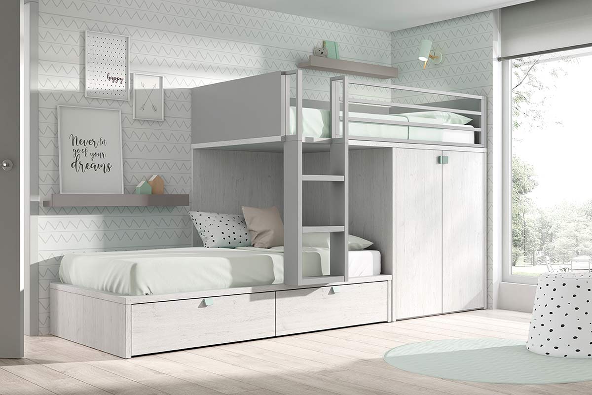 ¿Estás pensando en una litera juvenil para el nuevo dormitorio de tus hijos? Esta litera juvenil con armario y cajones te encantará. Puedes personalizarla a tu gusto, con tus colores favoritos y la ropa de cama que más te guste de esta colección. En los detalles podrás visualizar las distintas barreras quitamiedos de la cama superior, para personalizarla a tu gusto!!.