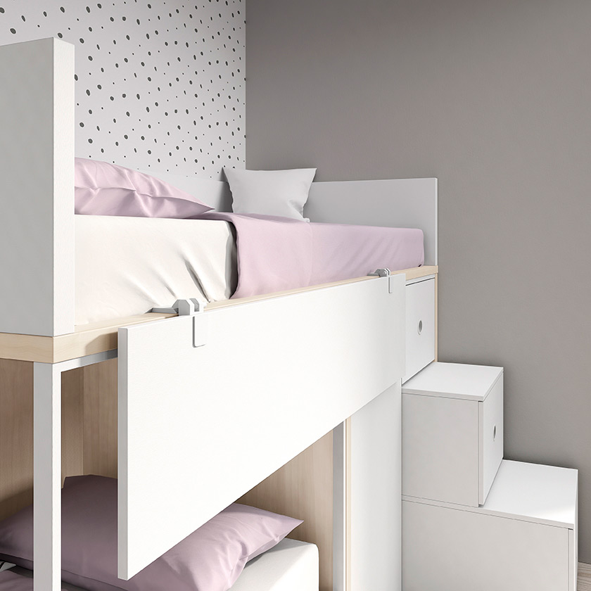 Cama tren diferente en todos los sentidos, a las camas tren convencionales. Para empezar no tiene una escalera convencional, sino que son dos cajones contenedores que se usan también para acceder a la cama superior. Por otra parte, el quitamiedos es abatible por lo que facilita muchísimo la tarea de hacer la cama, ¡¡¡se acabó el quejarse de lo dificil que es hacer las camas literas!!!.