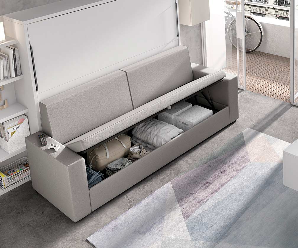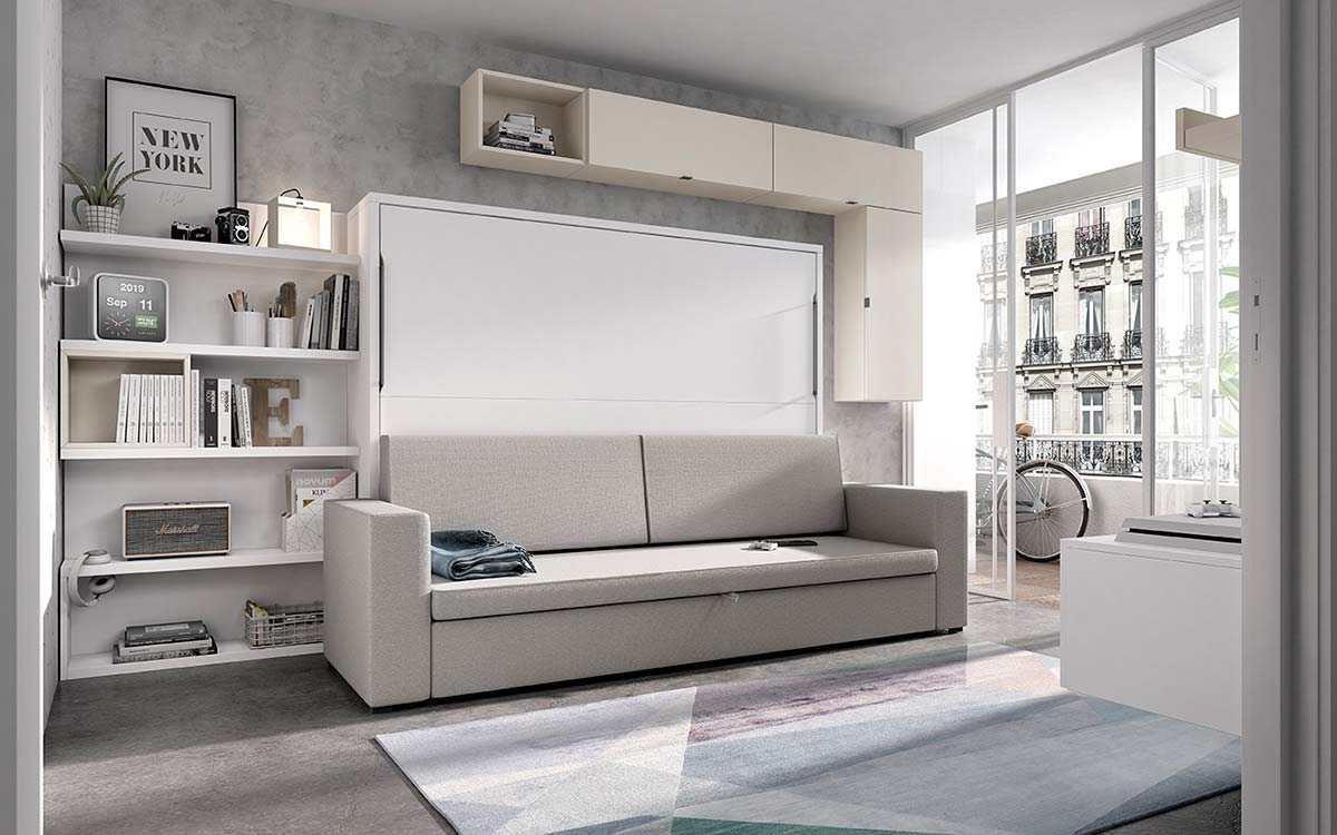 La cama abatible horizontal con sofá además, también dispone de estanterías en su interior.