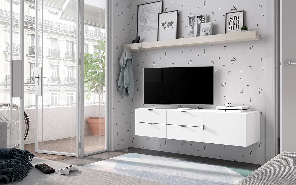 Aprovecha el espacio de la habitación con un aparador colgado con puerta y cajones, de la misma marca, donde podrás poner la televisión.