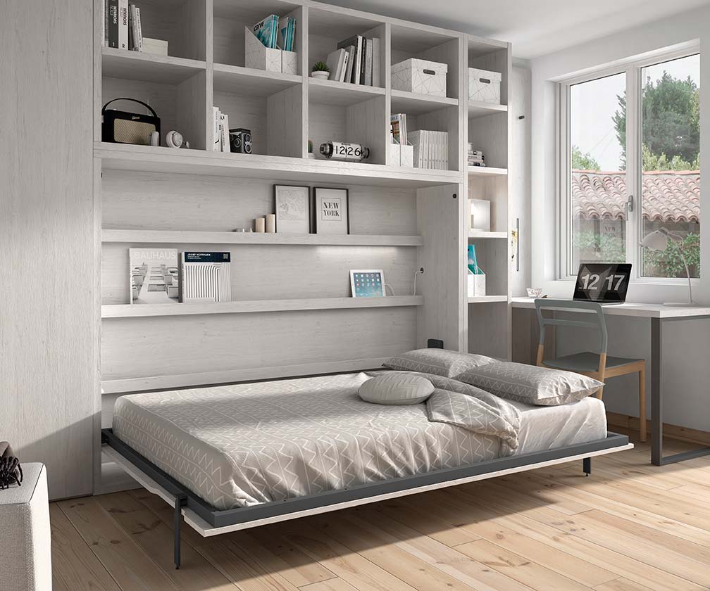 Una cama abatible de 135 para dormir a pierna suelta, utilizar las estanterías para decorar e incluso, en las estanterías interiores, encontrar un USB y luz LED. ¡Lo tendrás todo!