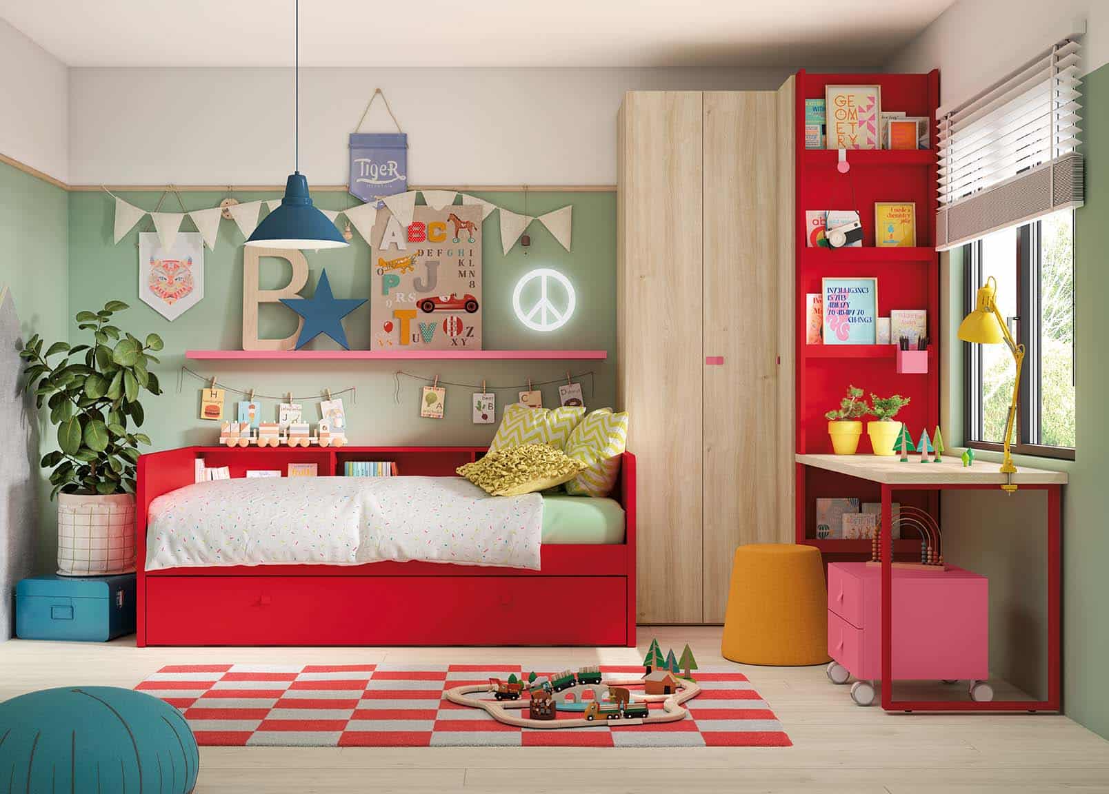 Crea un dormitorio infantil con todas las necesidades cubiertas: una cama nido y armario rincón amplio y un escritorio con pata metálica.