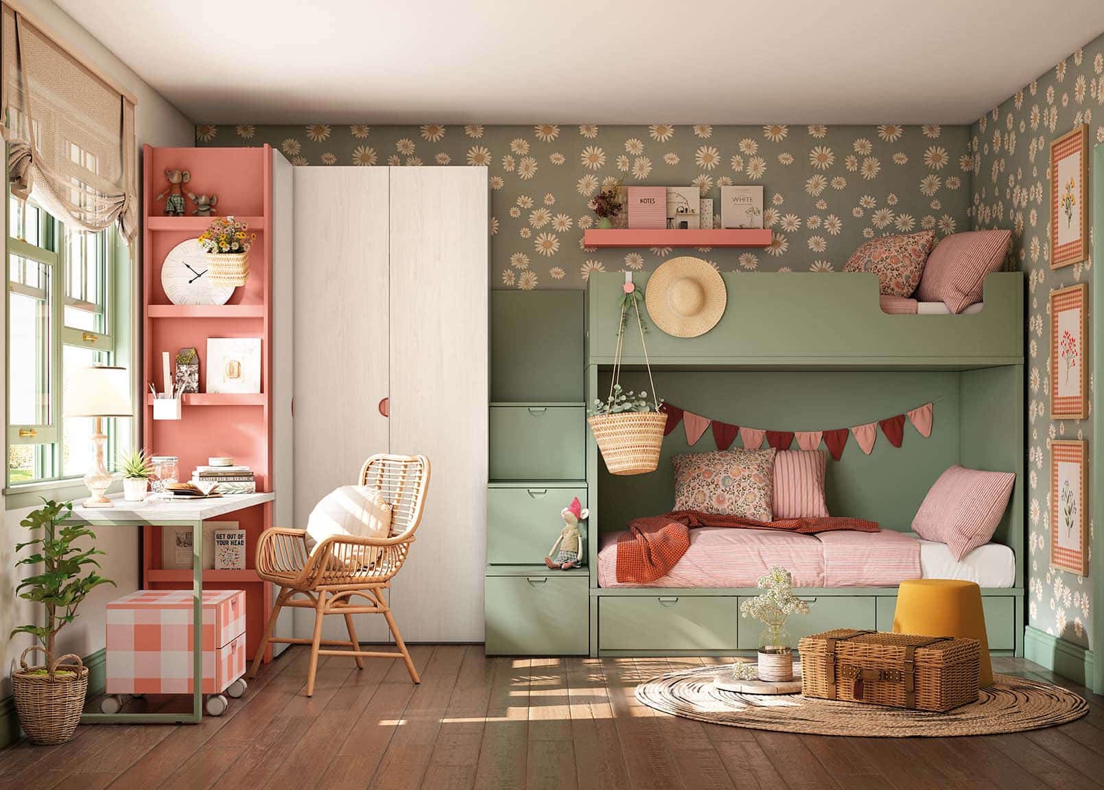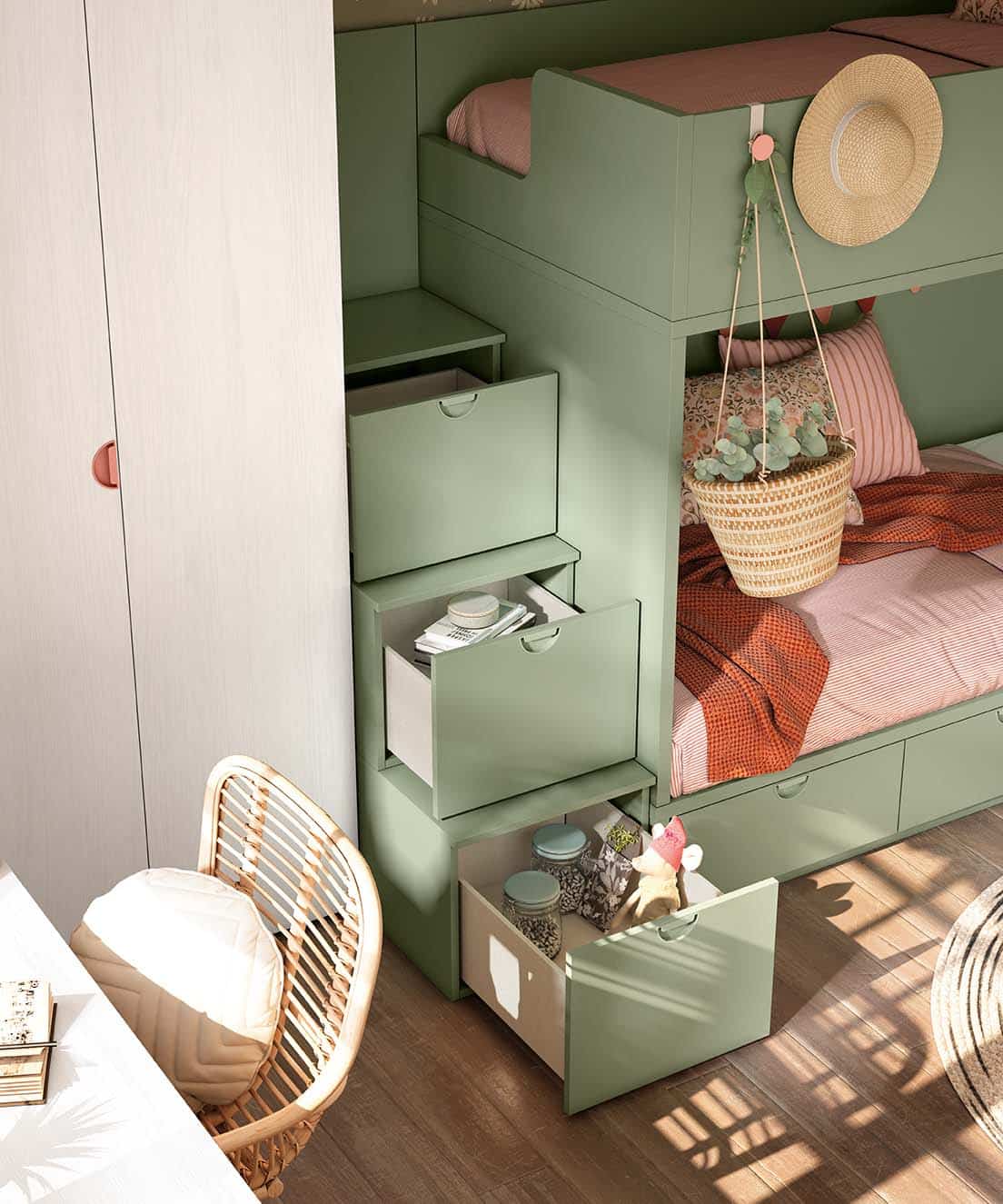 ¿Estás pensando en una litera juvenil para el nuevo dormitorio de tus hijos? Esta litera con escalera de cajones y armario te encantará. La puedes personalizar a tu gusto, con tus colores favoritos, nosotros hemos optado por el estilo cottagecore, ¿qué te parece?