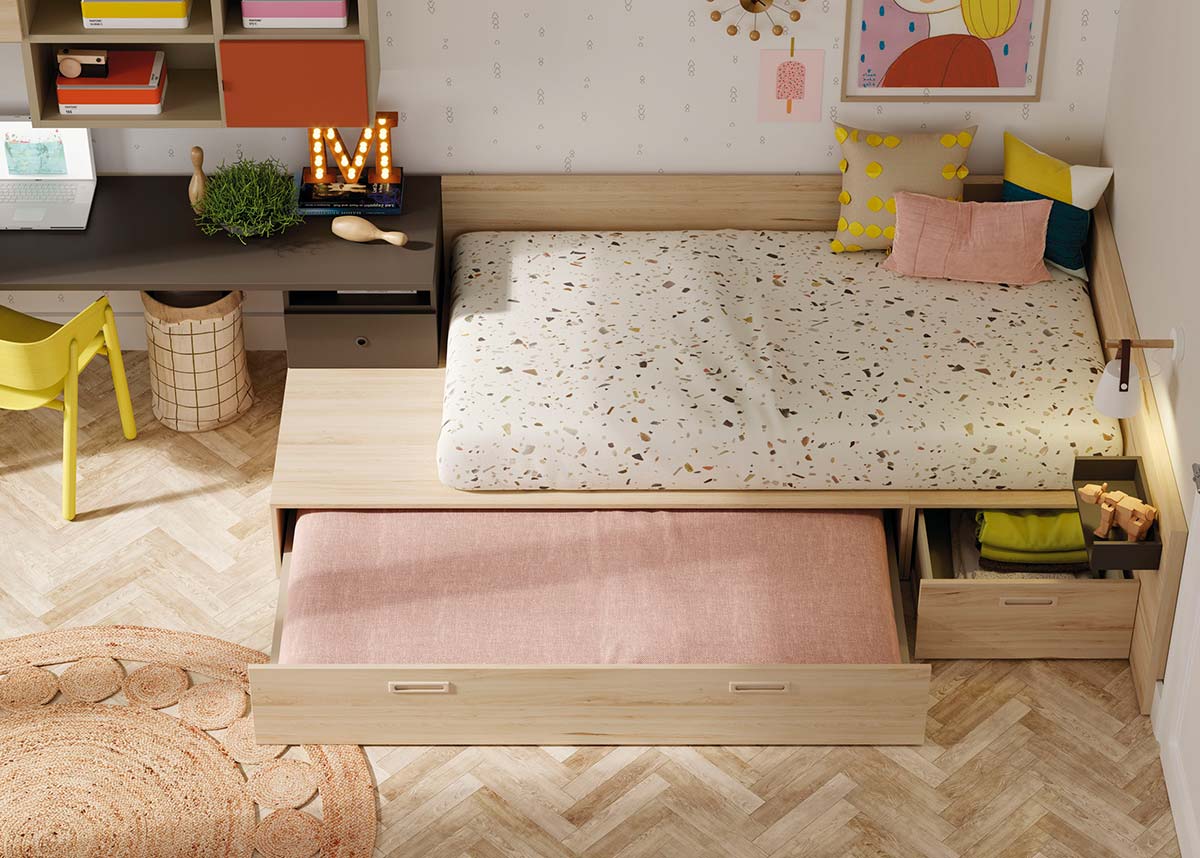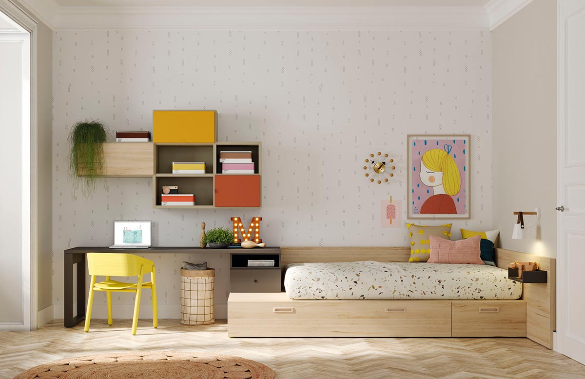 ¿Habías imaginado esta cama individual con almacenaje? fijate en este dormitorio juvenil compuesto del sistema Kubox, basado en conjuntos de cajones que permiten modelar un nuevo concepto de producto, espacios para dormir y para almacenar. El colchón va soportado por este conjunto de cajones. En este caso, la composición es completamente lineal y lleva apilada la mesa estudio. Además esta marca tiene gran variedad en escritorios para habitaciones juveniles.
