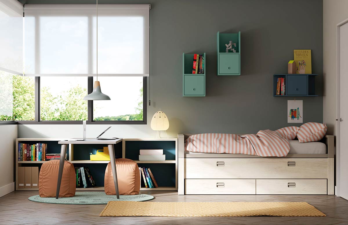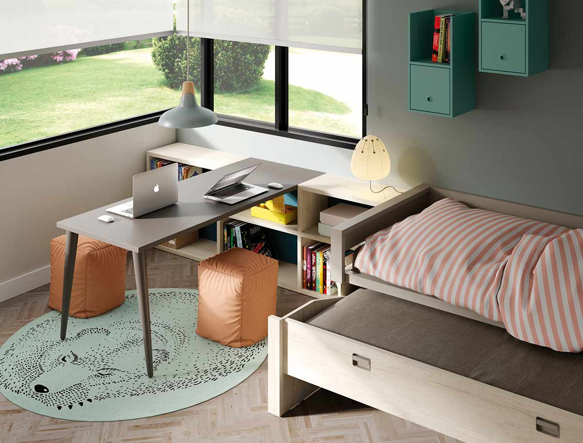 Dormitorio juvenil compuesto de cama nido con larguero preparada para llevar somier ó base tapizada, pensada para esos clientes que prefieren que la cama superior quede ajustada, la cama inferior va desplazable y oculta, a la altura del suelo lleva dos contenedores con guias que permiten gran capacidad.