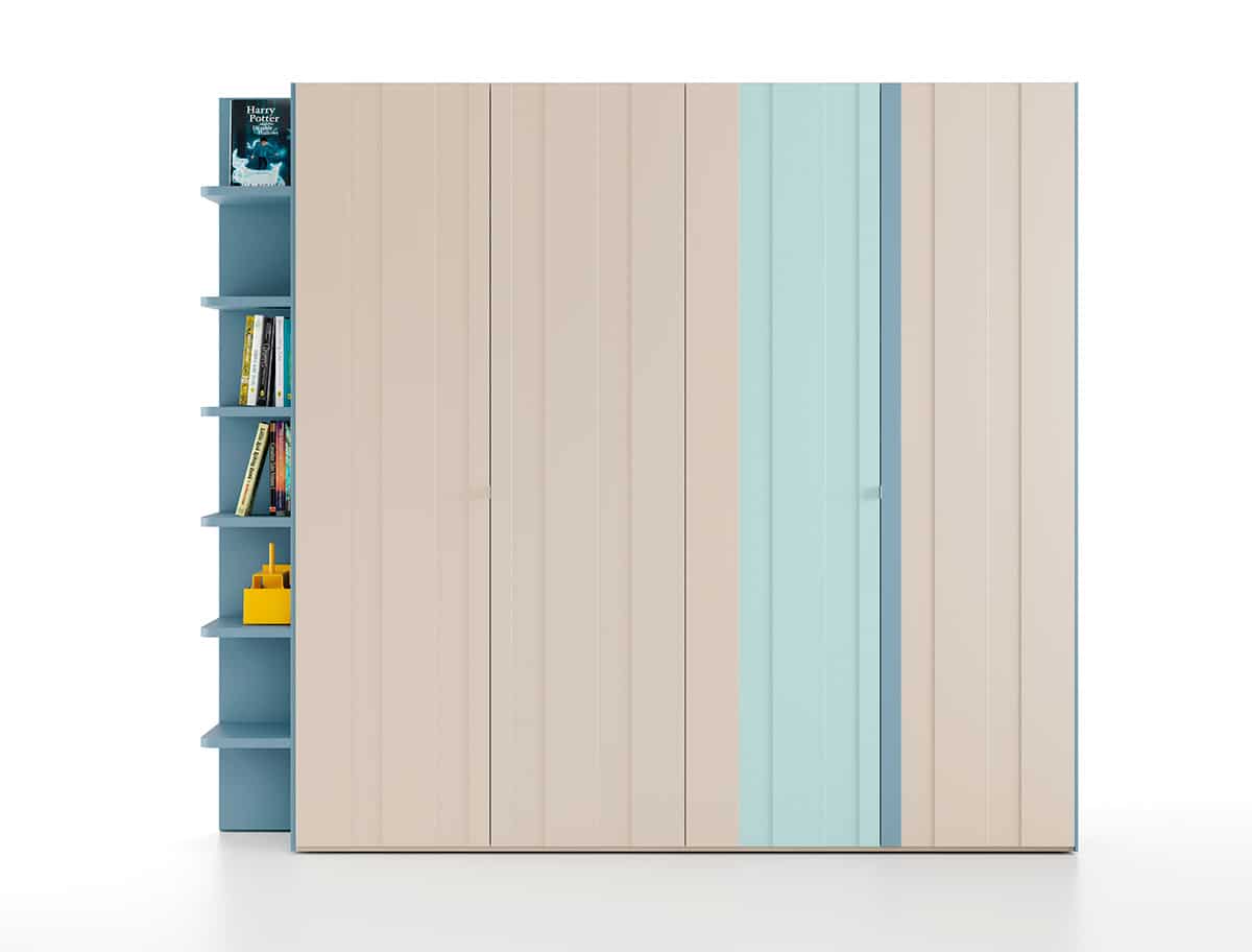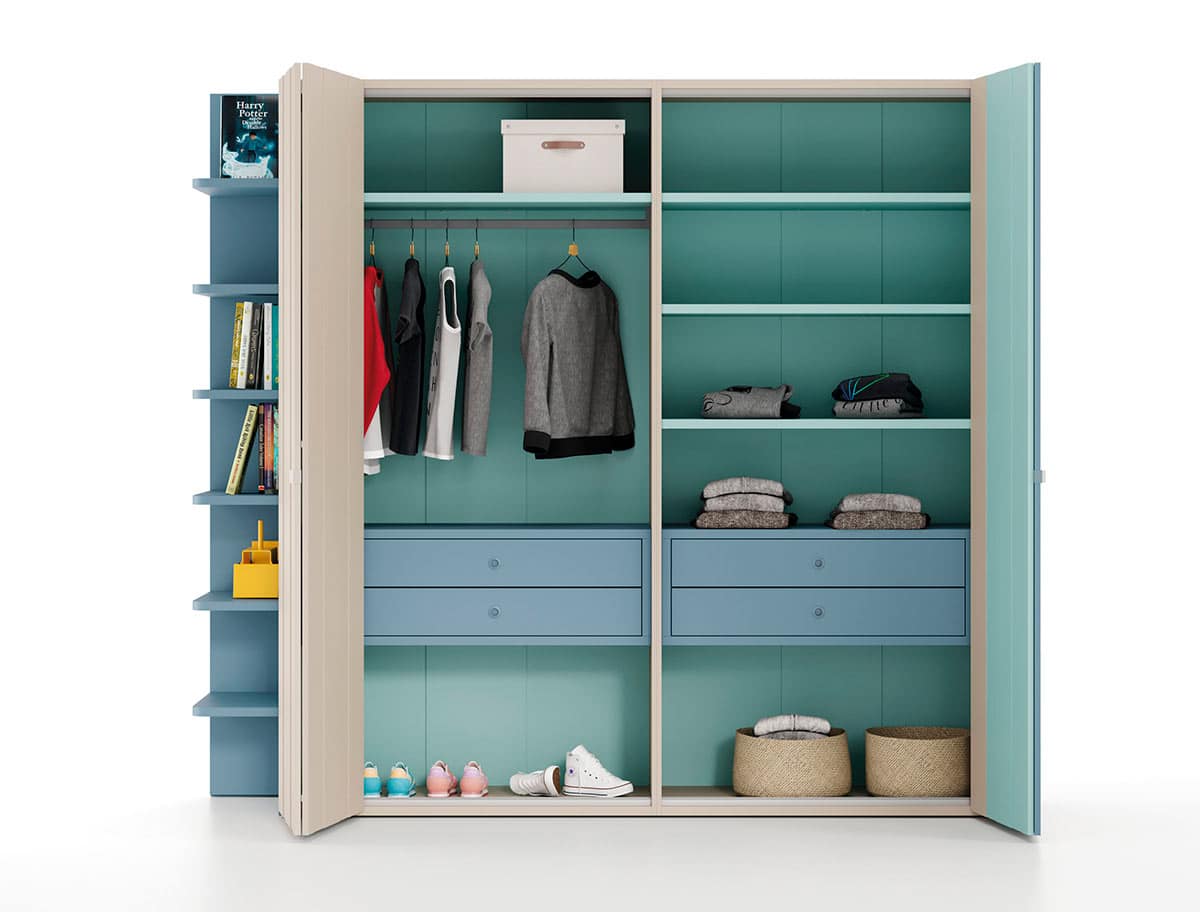 El armario lleva las puertas plegables con cuadro de guias Hettich certificadas con más de 60000 ciclos, el interior es personalizable en distribución y en toda la carta de color. Lleva un terminal estantería en el lado izquierdo visto de frente. En armarios juveniles es novedad.