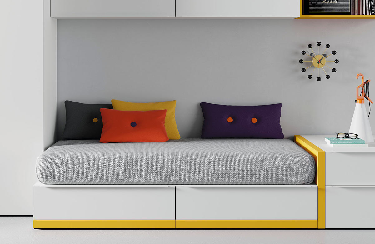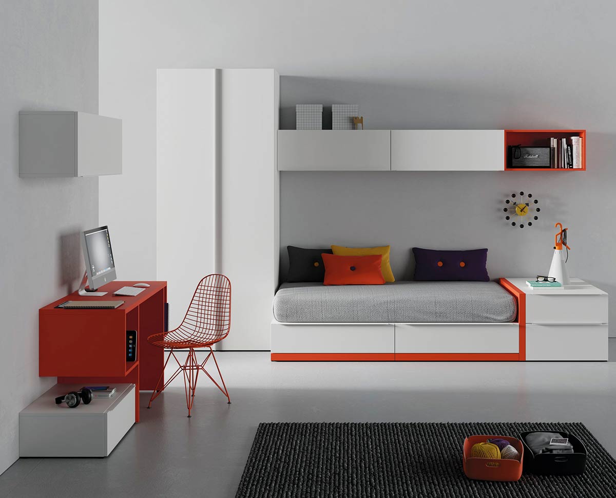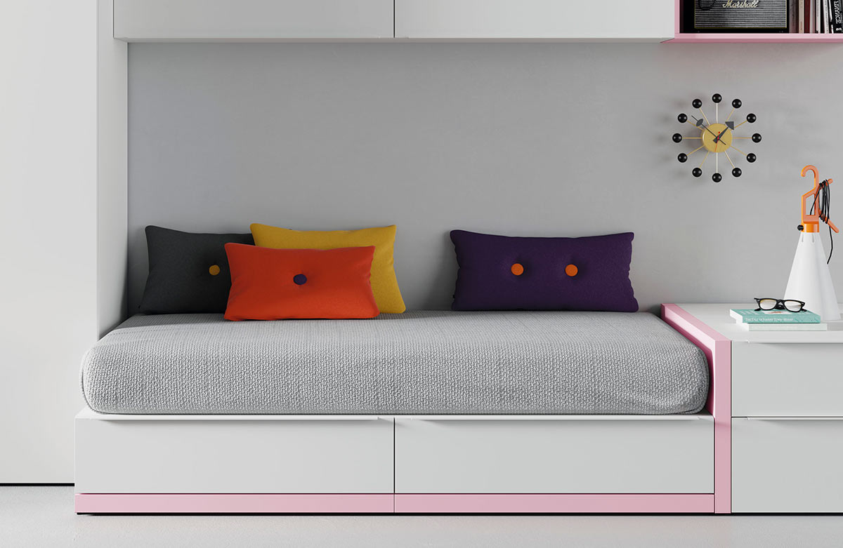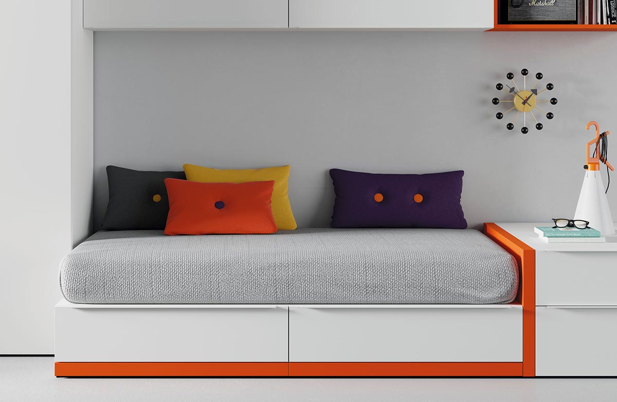 Dormitorio juvenil compuesto de una cama individual con cajones, estos cajones soportan el colchón, por lo tanto esta cama ya no necesita somier ó base tapizada aportando mayor firmeza al colchón. Además esta colección permite personalizar el zócalo de la cama en diferentes colores. Un dormitorio juvenil singular, único y muy personal. ¡Para tí que busca una marca de habitaciones juveniles modernas!