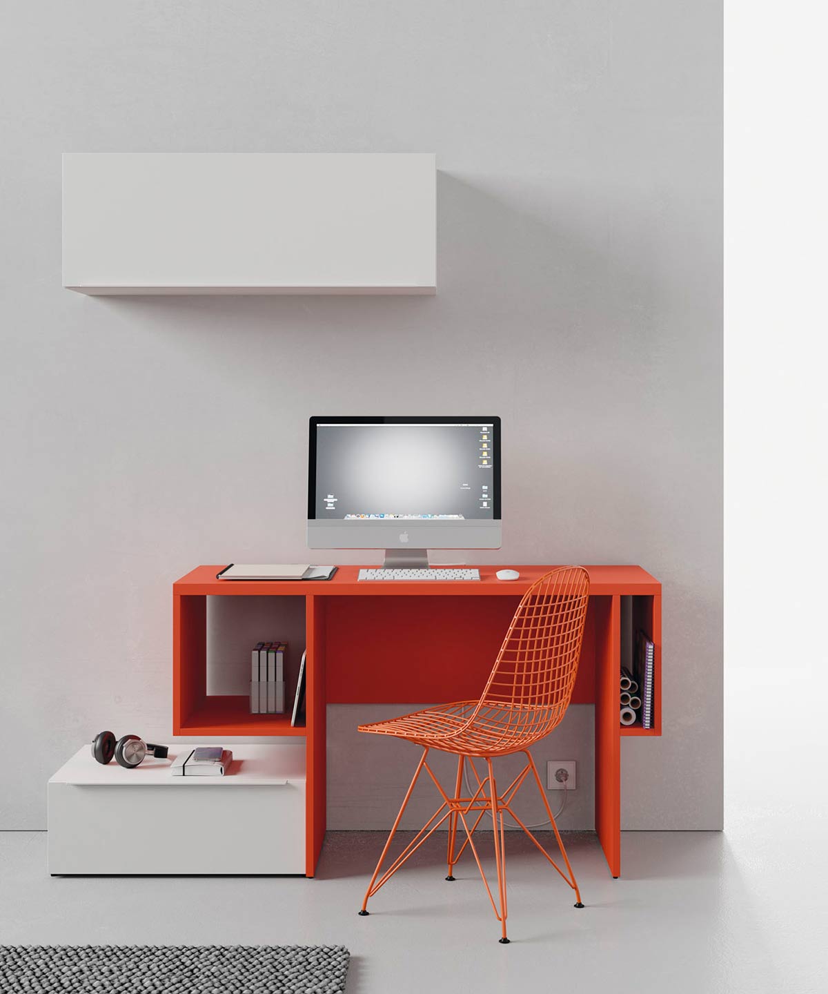 Zona estudio con mesa escritorio juvenil de original diseño, se complementa con un contenedor a suelo y modulo colgante elevable para una zona de estudio muy funcional.