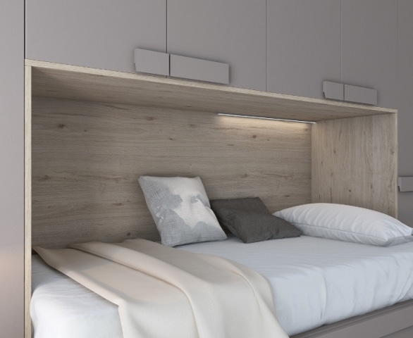 Sobre la cama a modo de contenedor hay un módulo diáfano fuelle para que quede todo más acabado y poder colgar por ejemplo la luz articulada con su cargador USB que ya es imprescindible en cualquier habitación.