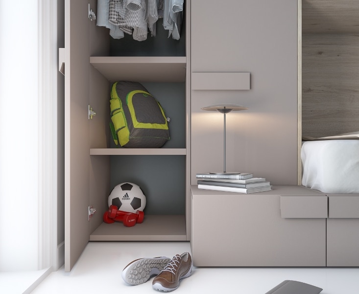 Un armario de una puerta completo y a su lado hay un armario sobre cubos que le da esa chispa a la composición pues crea una asimetría divertida.