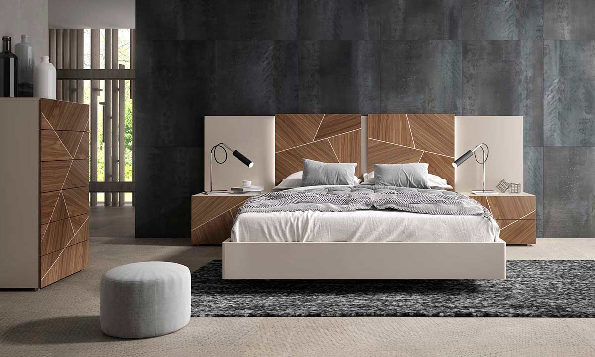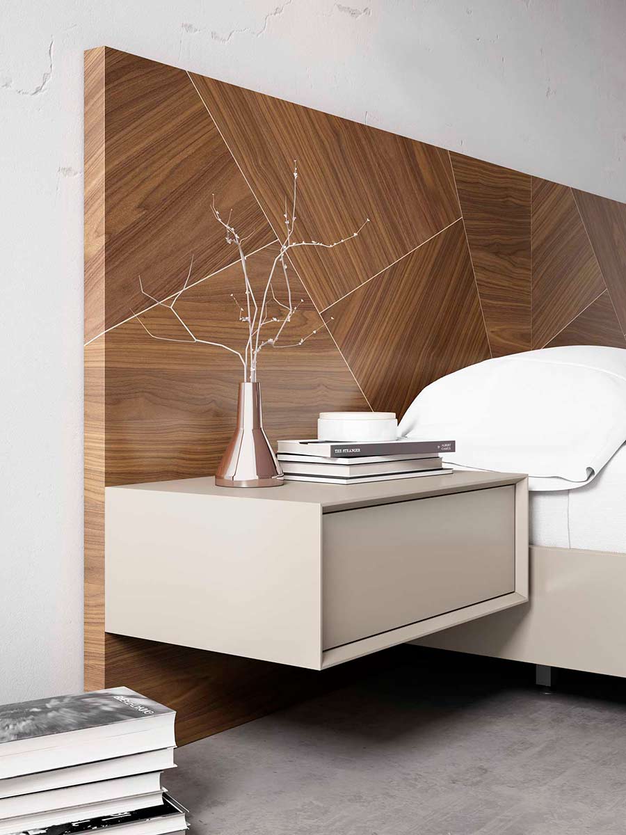 Junto con el cabezal se han combinado dos mesitas una colgante al cabezal y otra asimétricamente a suelo. Si nos fijamos en los detalles fotográficos encontraremos que el remate de la mesita va a inglete y el acabado va lacado en color Moka, símbolo de calidad y artesanía de alto nivel que mencionábamos anteriormente.