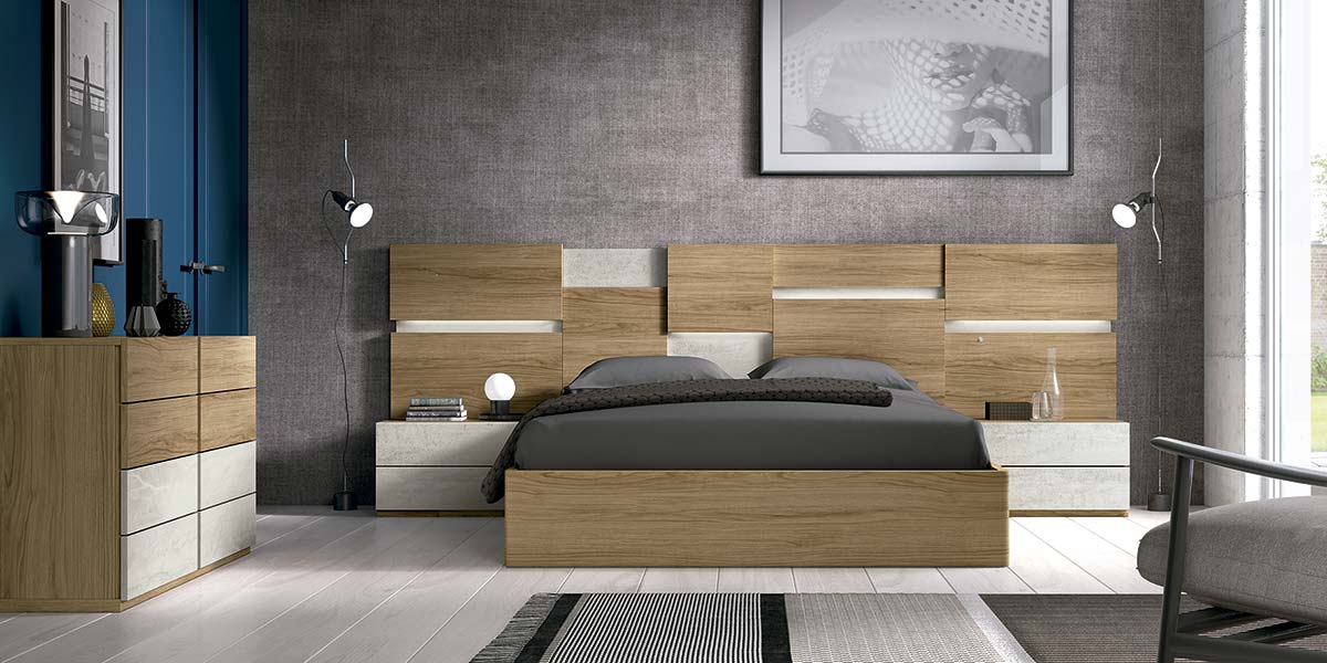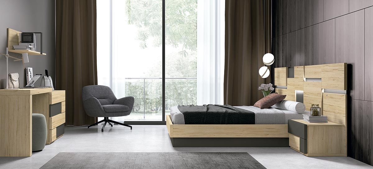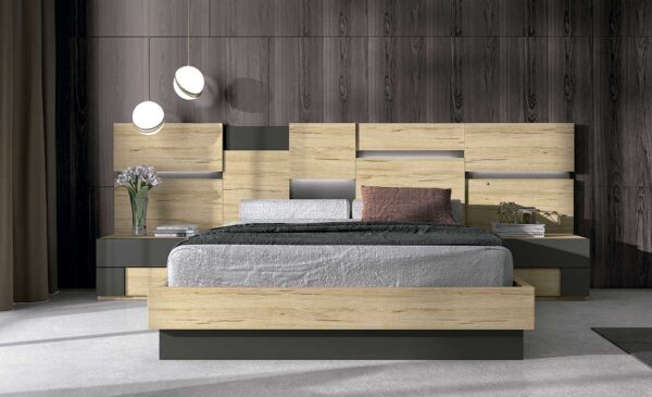 Cabecero de cama compuesto por 8 paneles asimétricos el cual debe de llevar los 8 paneles en el mismo color, además este modelo lleva incorporada luz led. Opcionalmente se puede instalar un conector con doble cargador USB para que puedas cargar tu móvil fácilmente. Este formato de cabezales se ajustan a la medida de tu colchón y a la medida de las mesitas de noche que desees. Se ha complementado con un aro de bañera para poder ajustar la ropa de cama y con unas mesitas de noche donde el frente del primer cajón es de 3,5 cm de grosor obteniendo como resultado un acabado excelente.