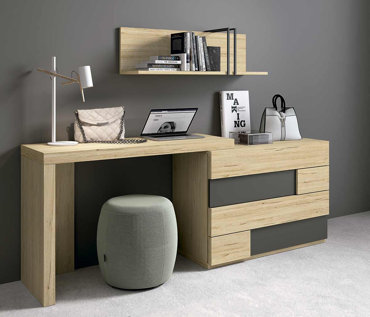 En los detalles fotográficos encontramos un original mueble auxiliar que consta de un escritorio volado de 120 cm con una cómoda de cajones también de 120cm para poder realizar tus gestiones en tu ordenador portátil y almacenar todo lo que necesites en tu cómoda de cajones. Al ir apilado ocupa un espacio de 200 cm, si no dispones de ese espacio hay opciones de escritorios que no van apilados desde 120 cm de largo. También podrás encontrar un armario de 4 puertas batientes y diferentes combinaciones de color para el mismo dormitorio.