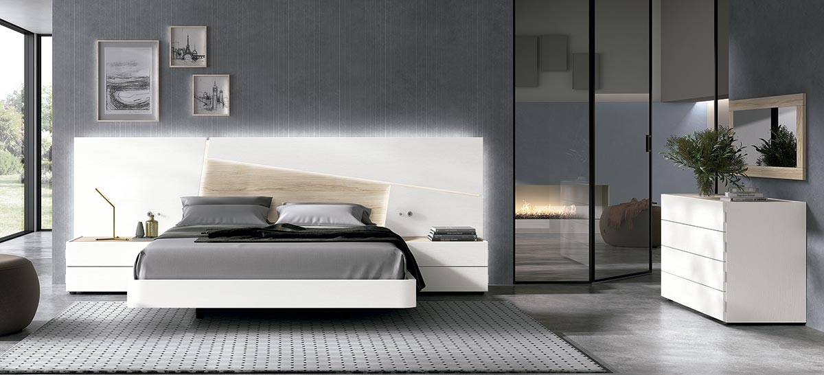 Dormitorio de matrimonio acabado en color natural y blanco, una combinación con gran tendencia en la actualidad. Se ha combinado con unas mesitas de noche de 2 cajones y aro de bañera con cantos redondeados, para evitar dolorosos golpes y poder ajustar la ropa de cama por dentro de este y el resultado lo podemos apreciar en la fotografía la impresión es que la cama queda en el aire, opcionalmente esta marca tiene canapé abatible en caso de que tengas falta de espacio para organizar tus cosas sustituyendo el aro de bañera.